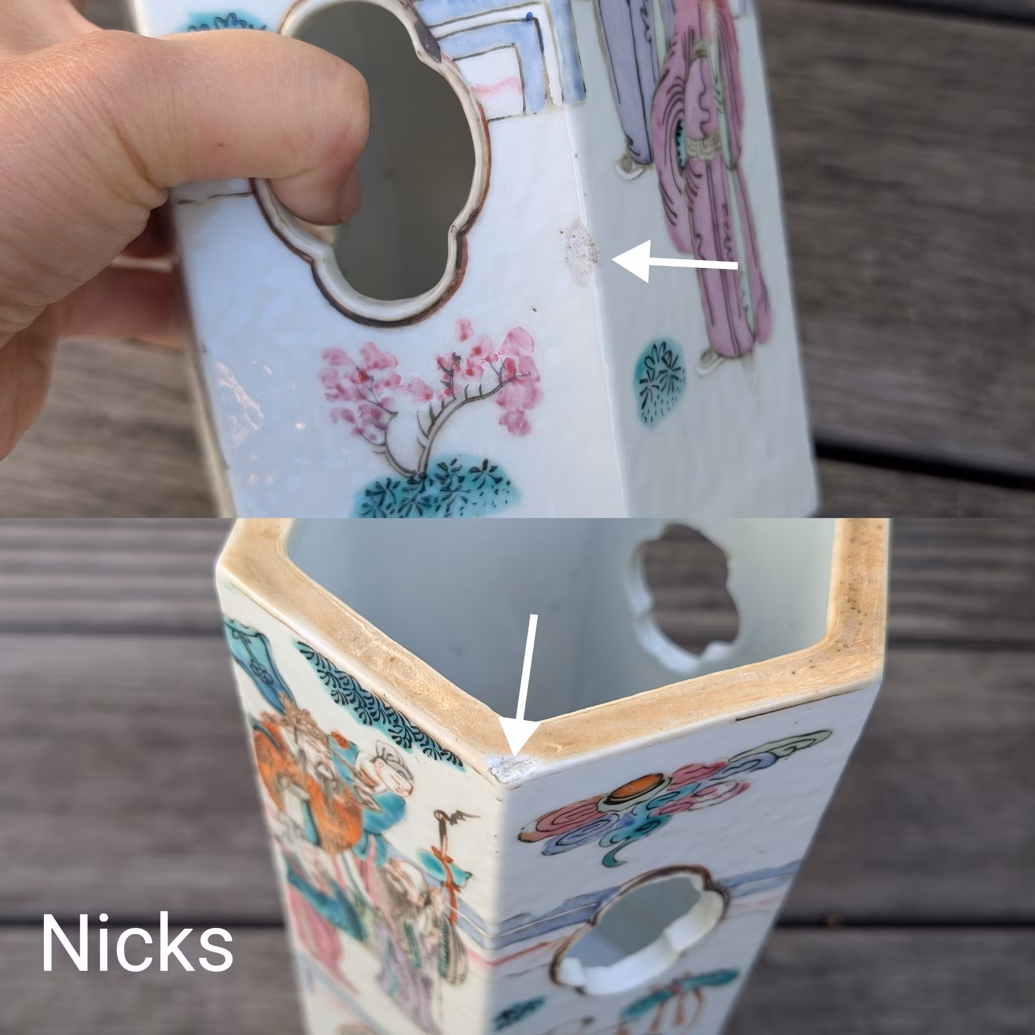Checked with UV Light. No restoration. No crack. No hairline. One nick to the top rim, one nick to the body, some minor glaze fritting's and nicks around the openings. General wear and manufacturing flaws .