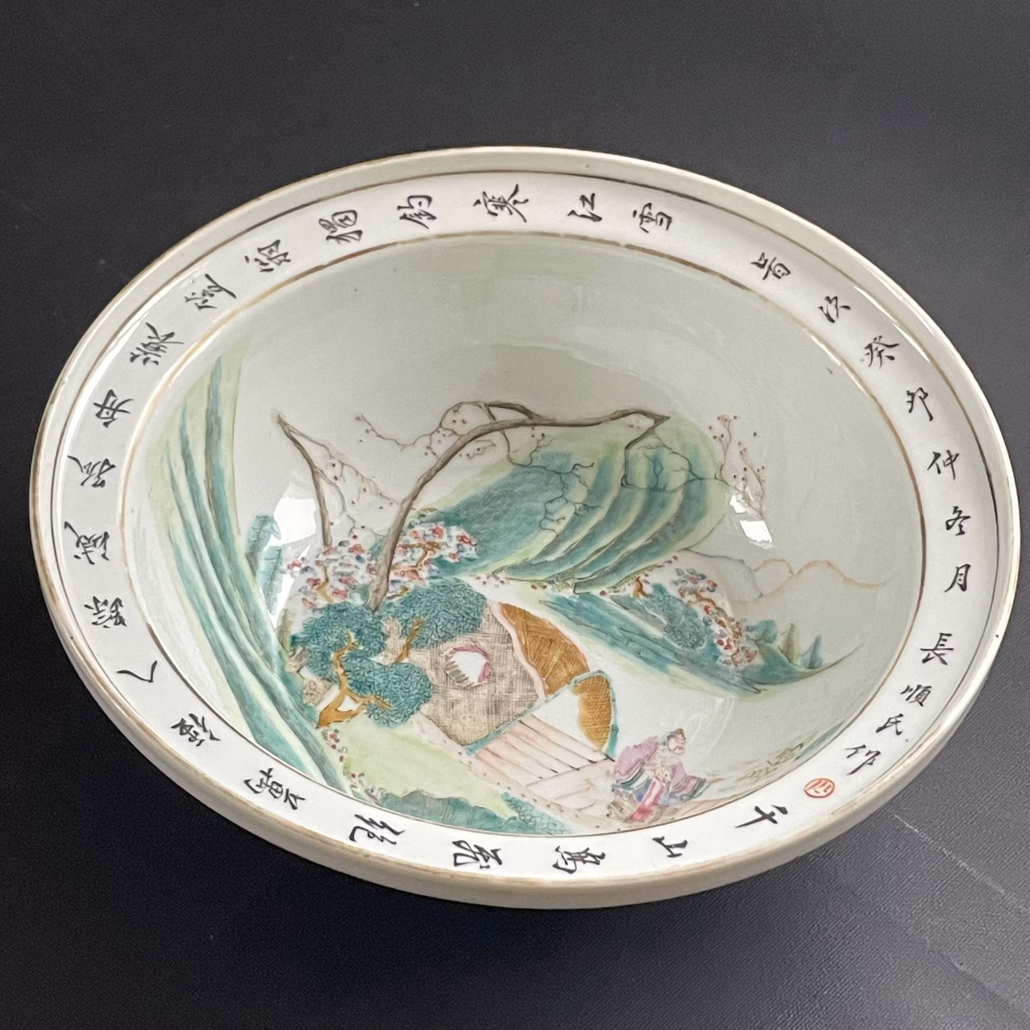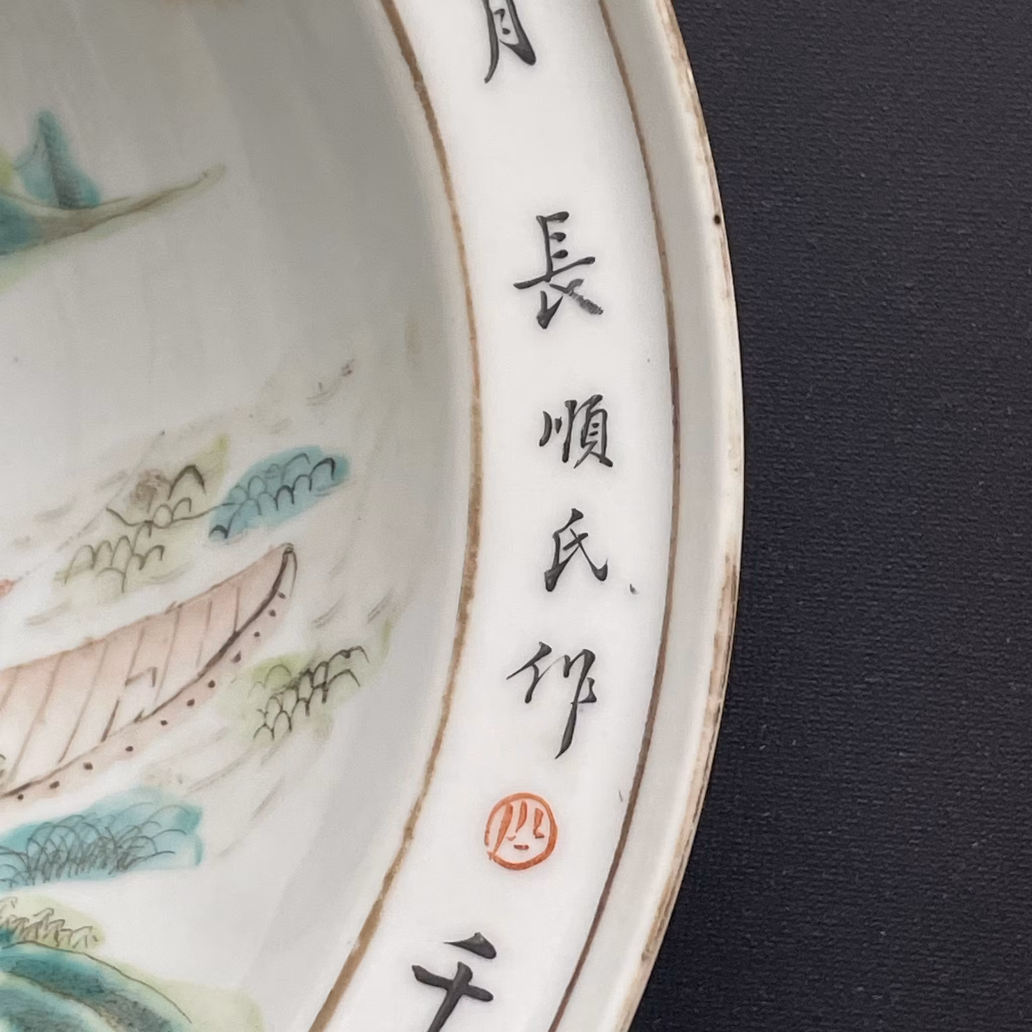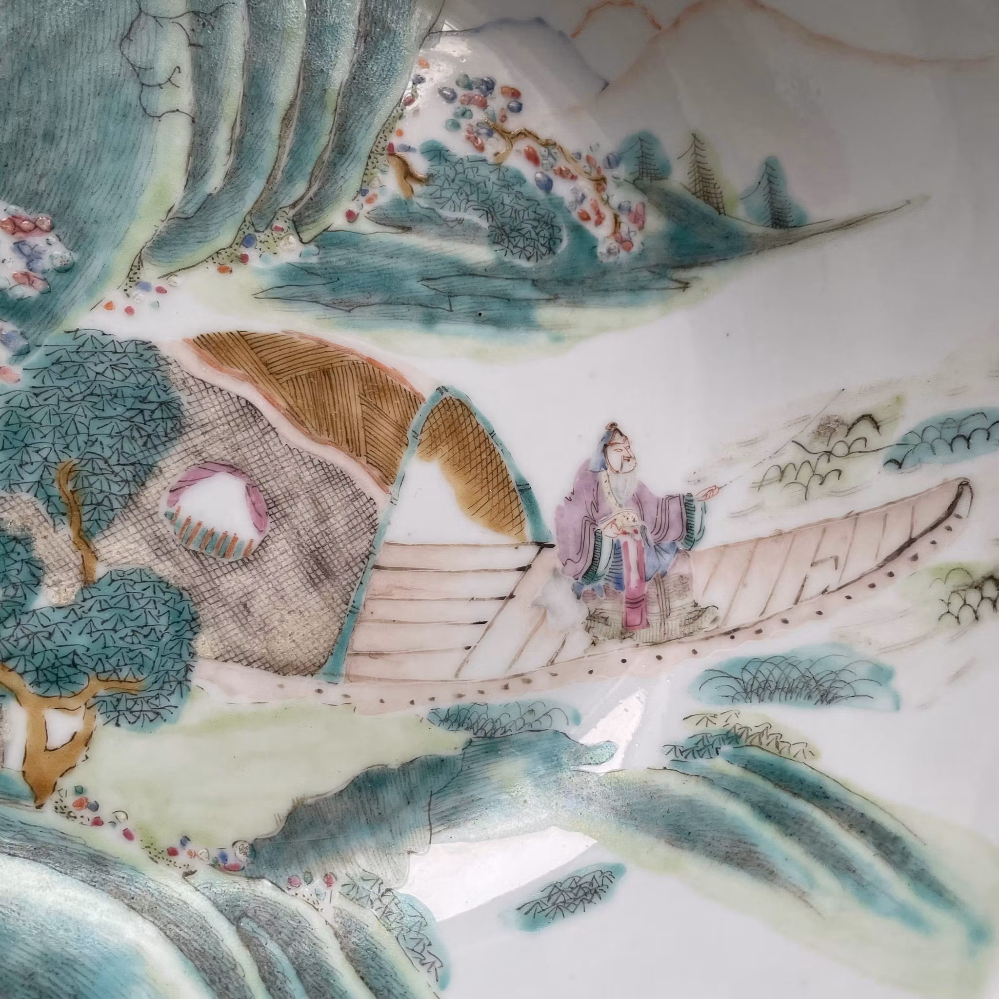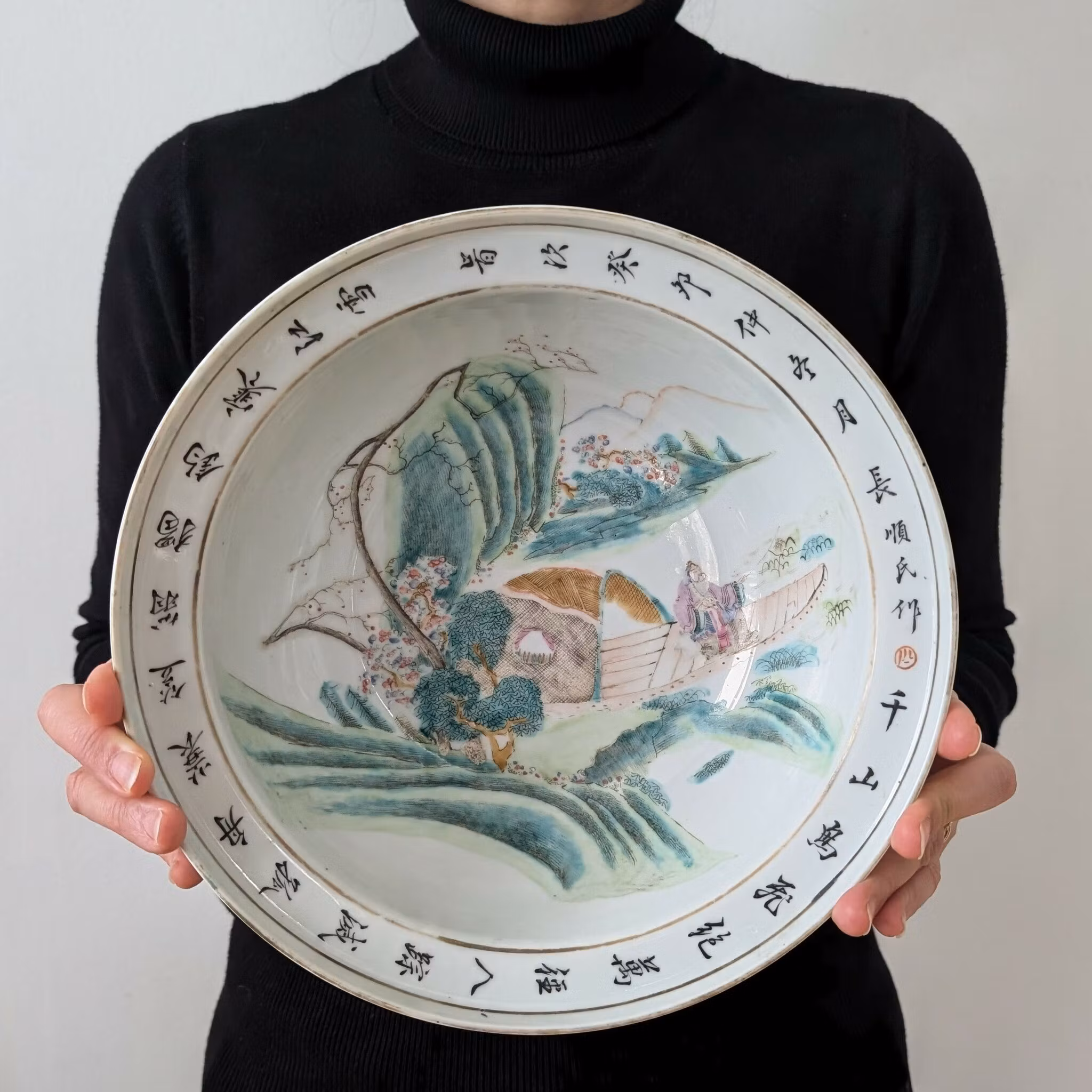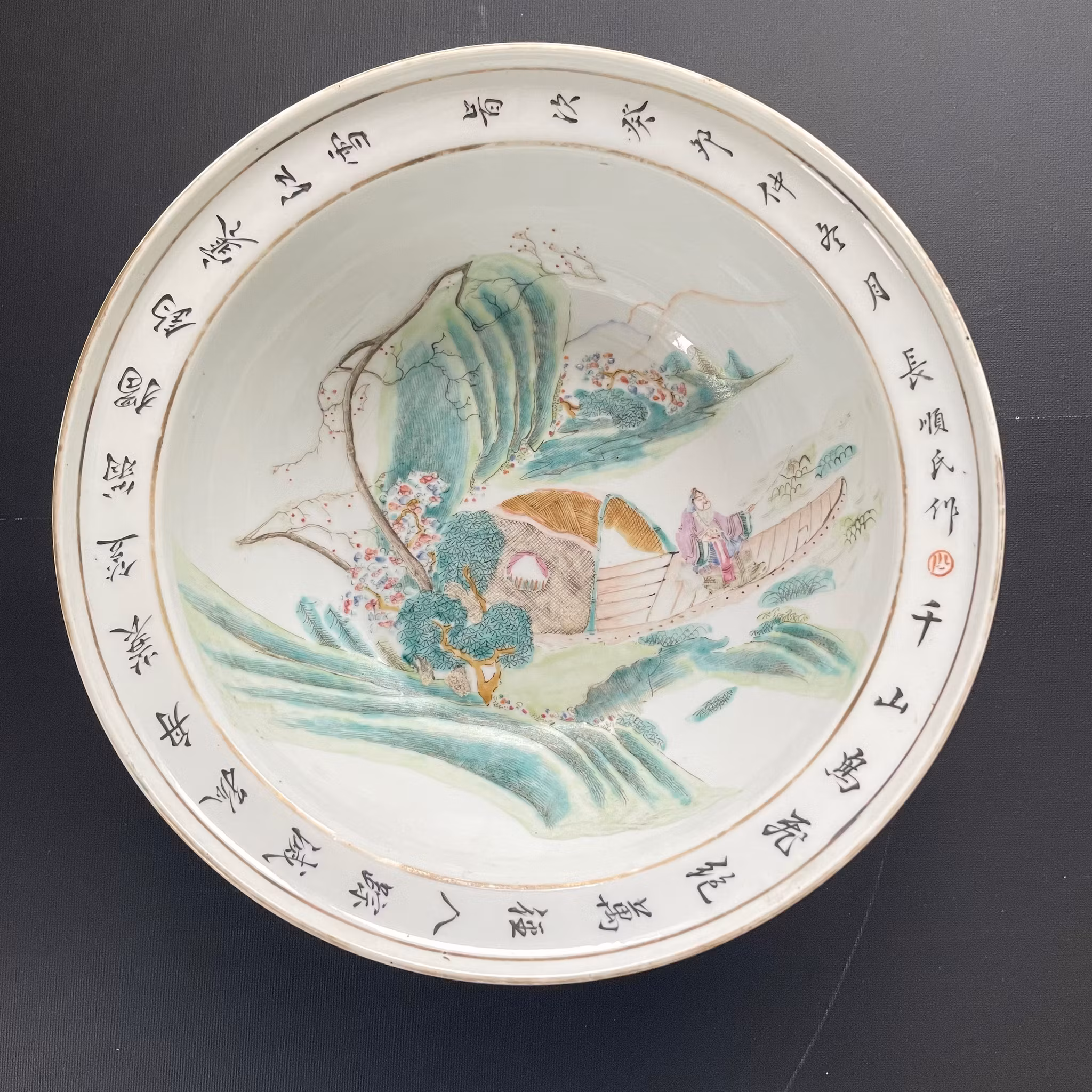 Beautiful basin decorated in Qianjiang Cai. Very nice painting utilizing the shape of the bowl to create movement. The front of the boat is painted using the side of the bowl giving it a 3 dimensional feeling. If filled with water it creates a nice 3D effect. Signed and dated to the year 1903, Guangxu period.