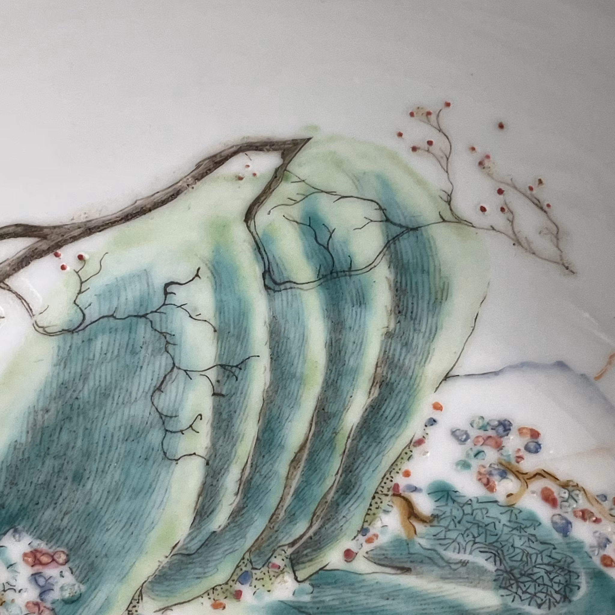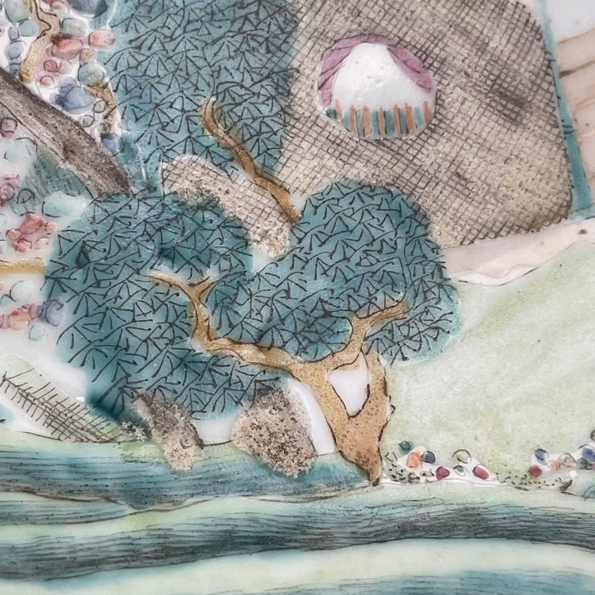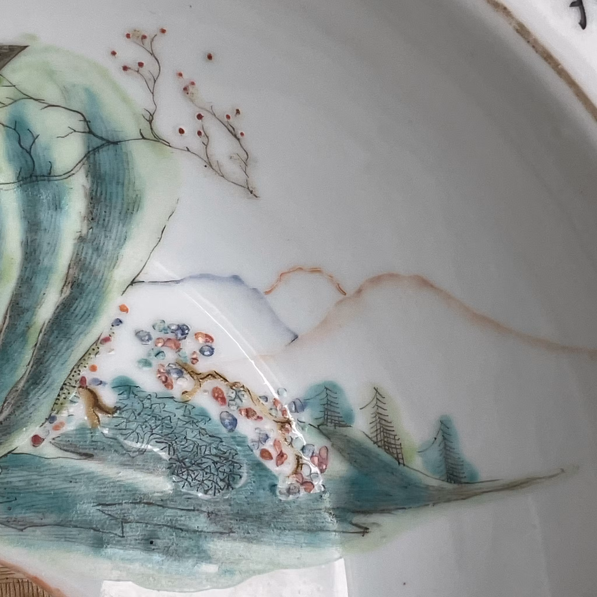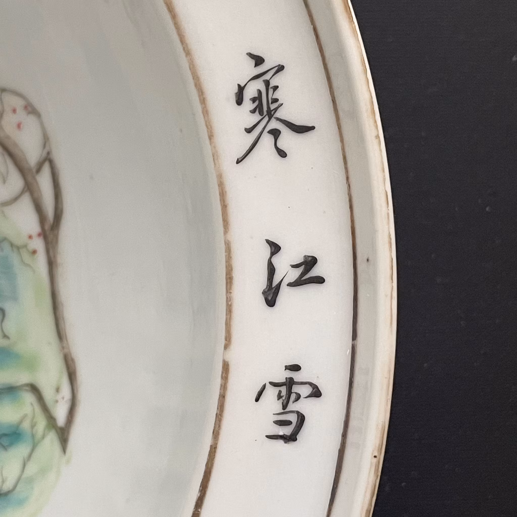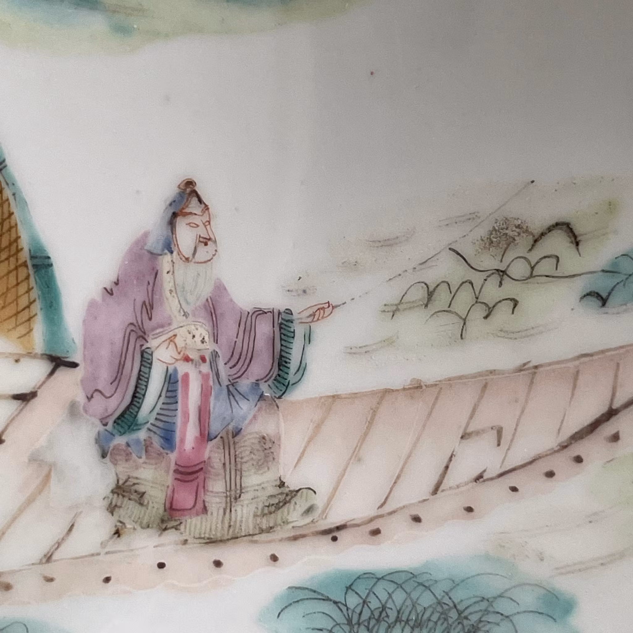 Beautiful basin decorated in Qianjiang Cai. Very nice painting utilizing the shape of the bowl to create movement. The front of the boat is painted using the side of the bowl giving it a 3 dimensional feeling. If filled with water it creates a nice 3D effect. Signed and dated to the year 1903, Guangxu period.