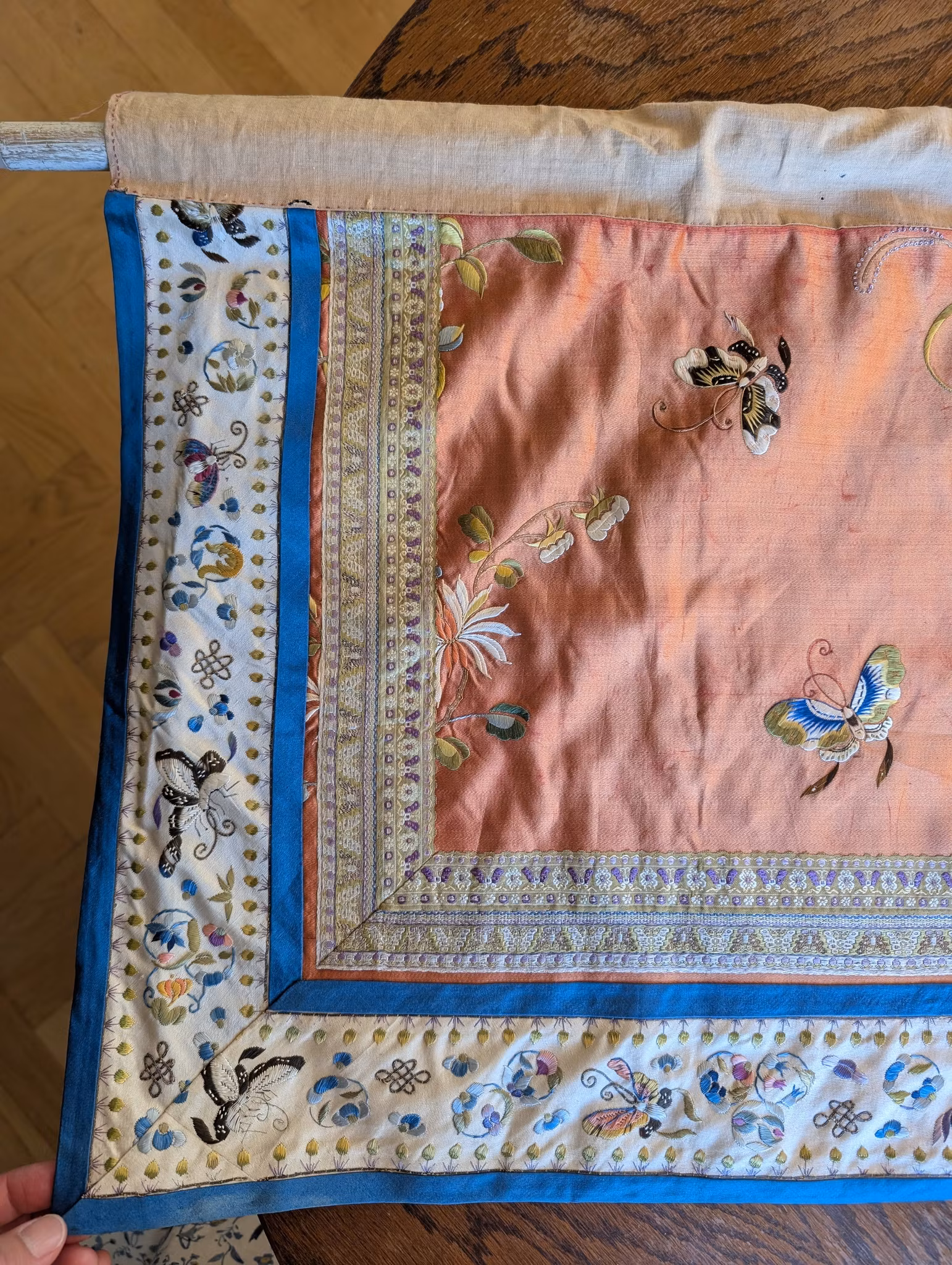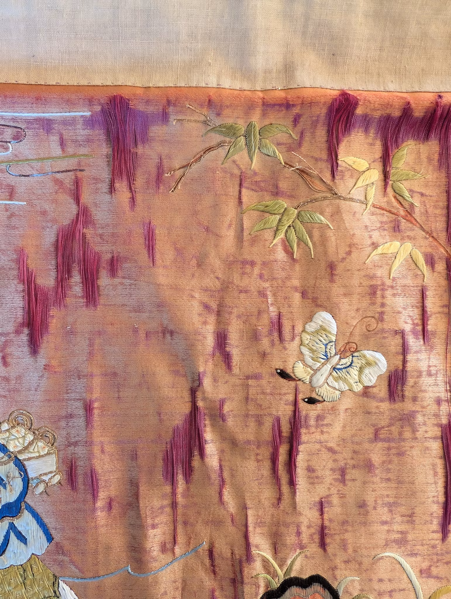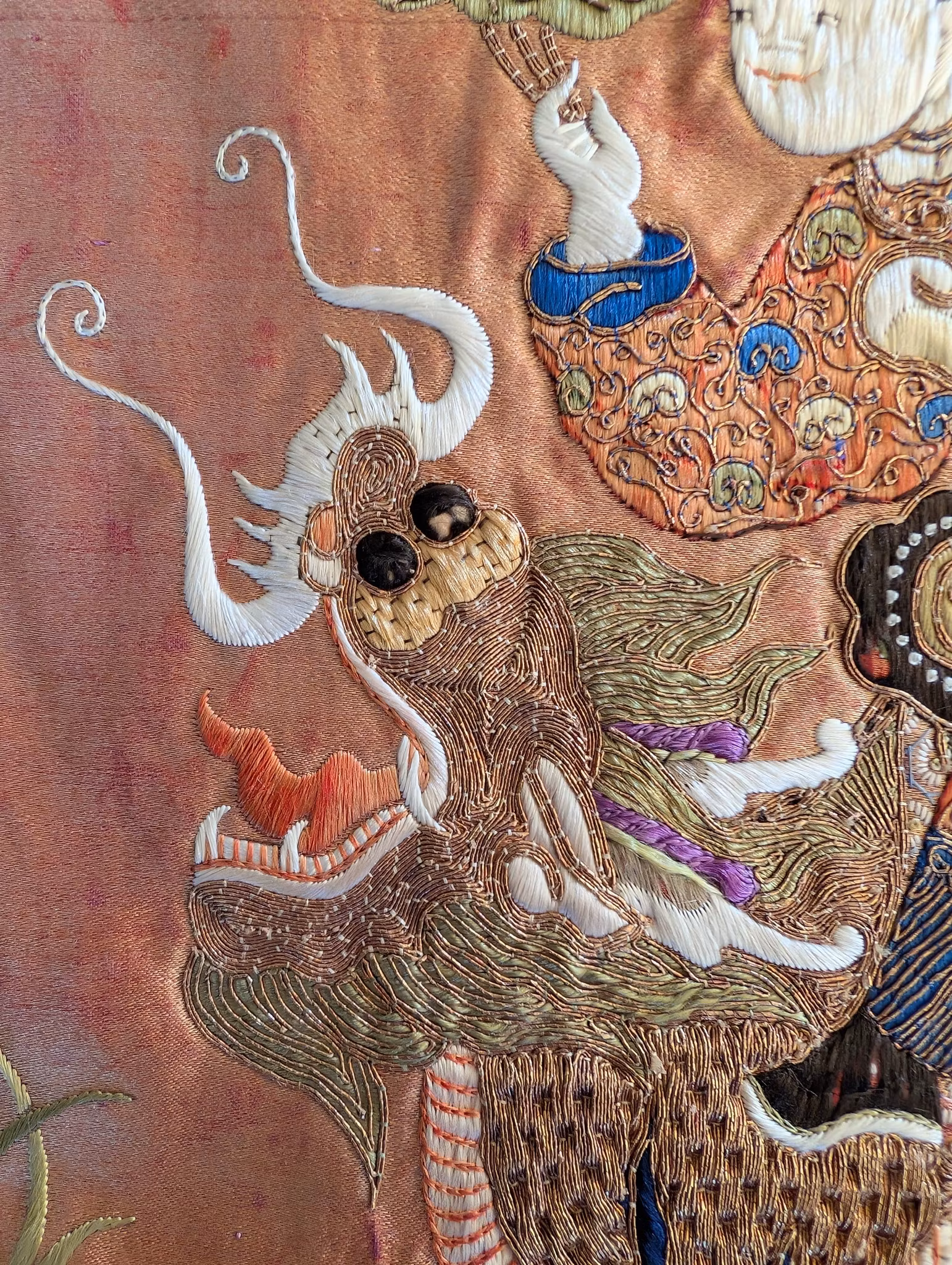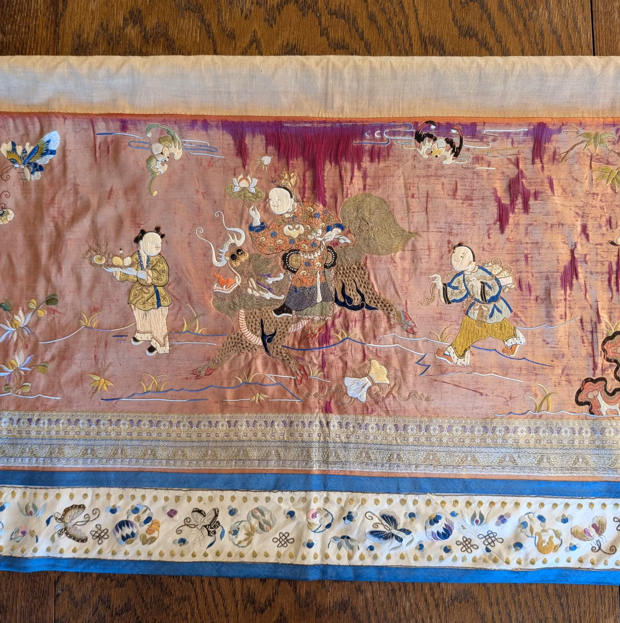 Beautiful large silk embroidery of a person riding a Qilin in the center 麒麟送子, surrounded by two other persons and flowers, fruits and butterflies.