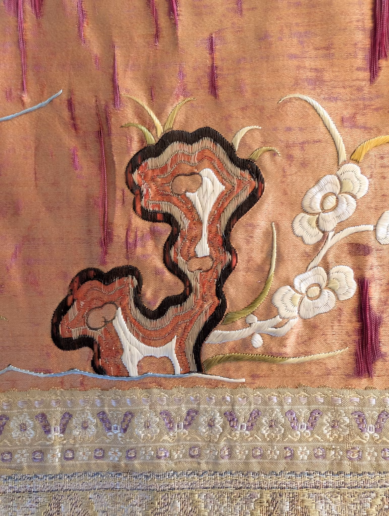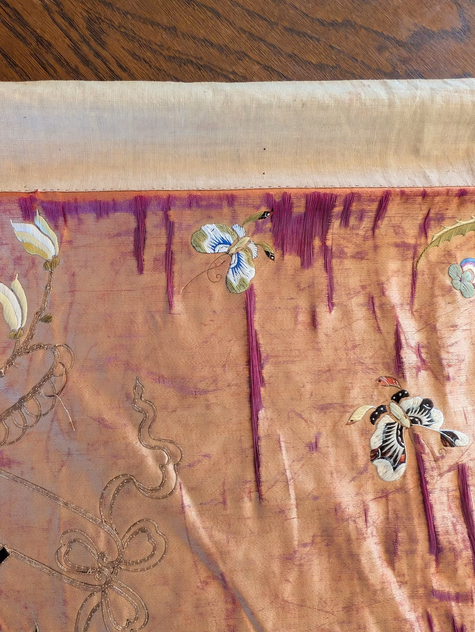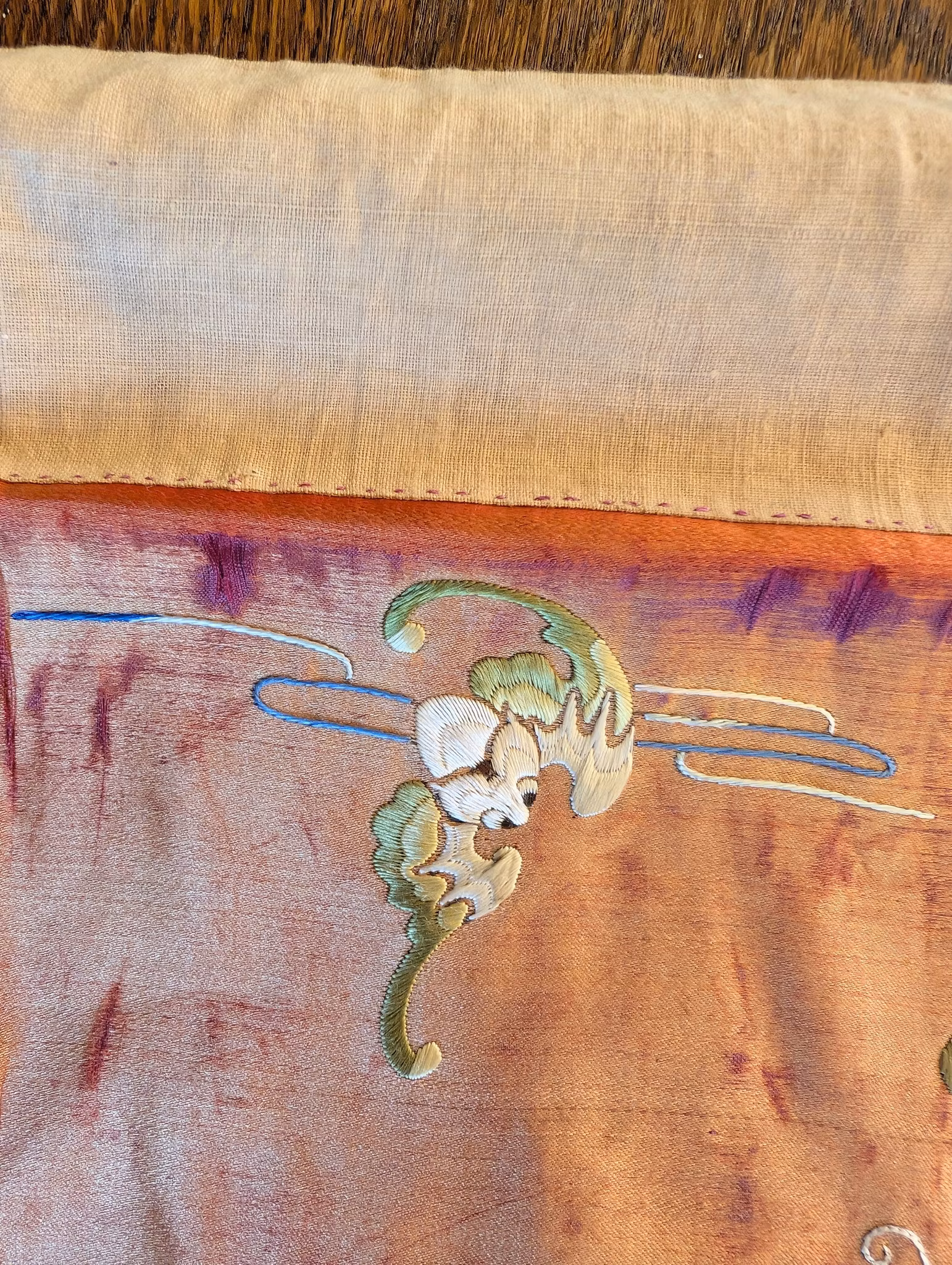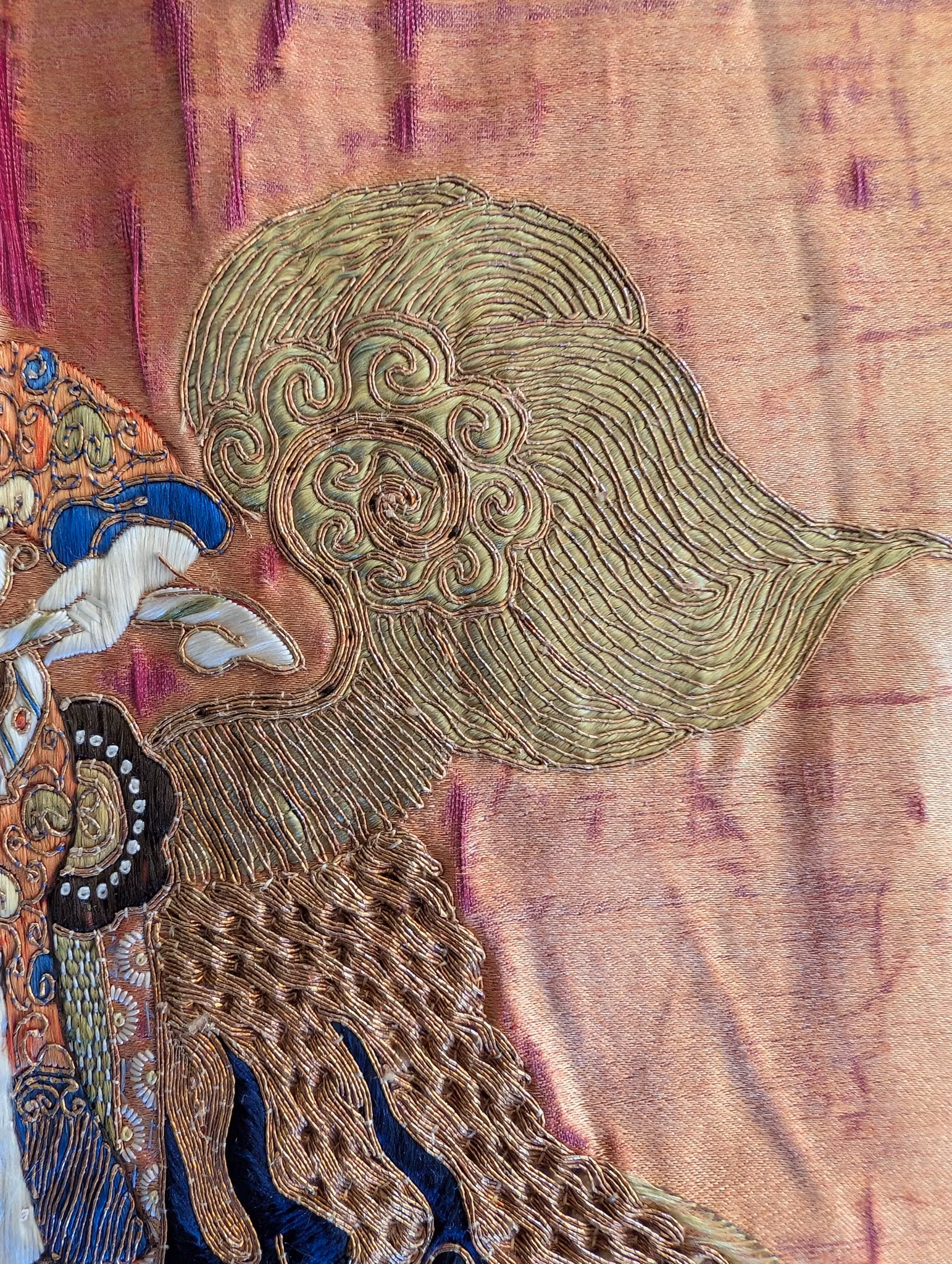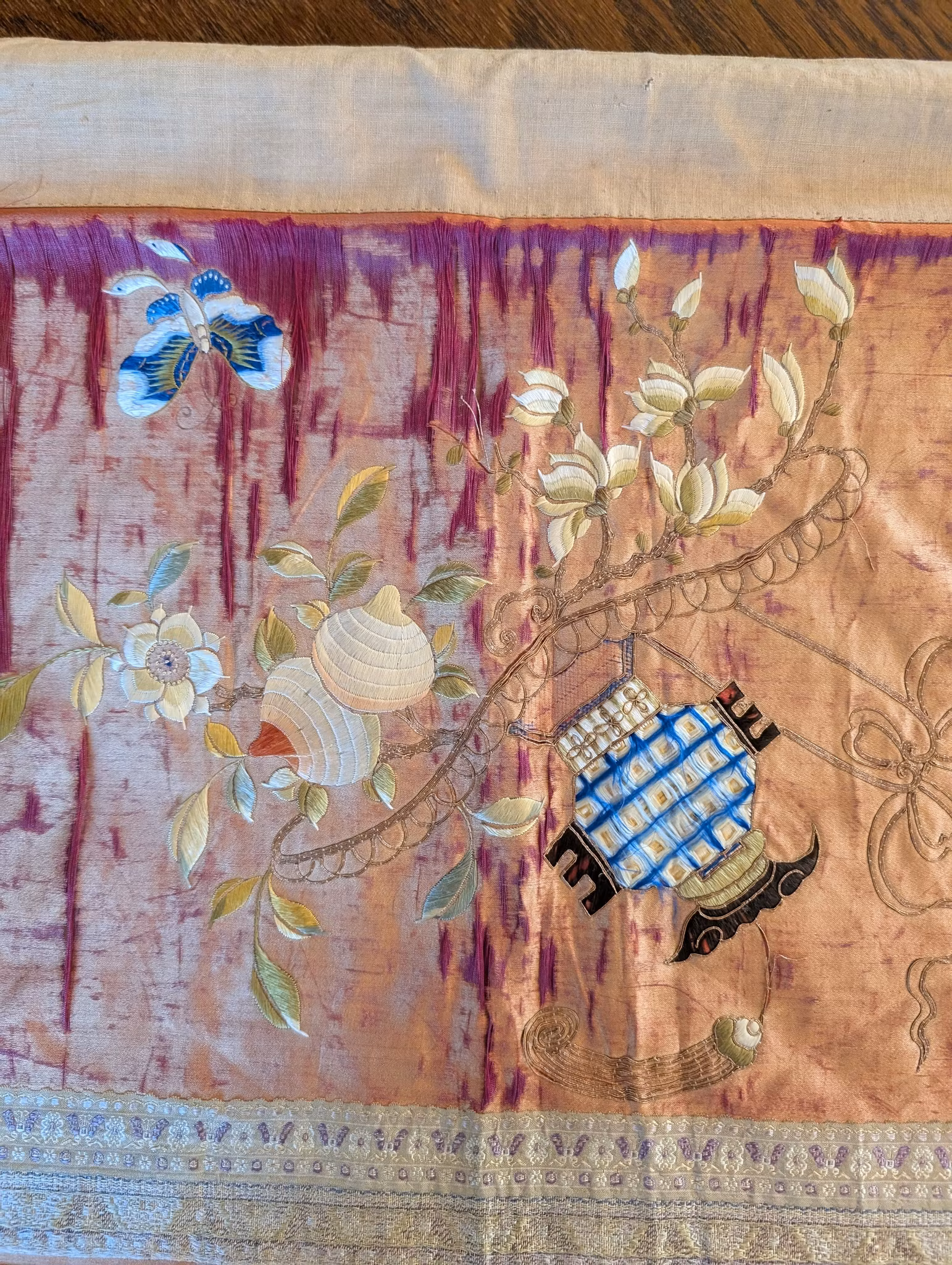 Beautiful large silk embroidery of a person riding a Qilin in the center 麒麟送子, surrounded by two other persons and flowers, fruits and butterflies.