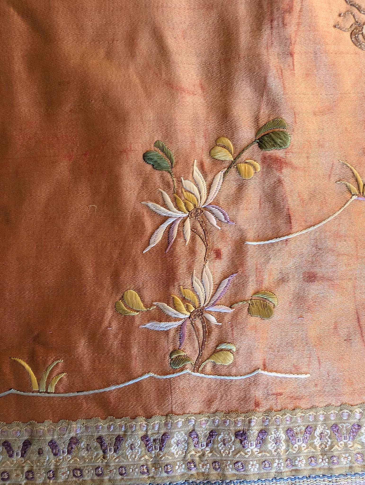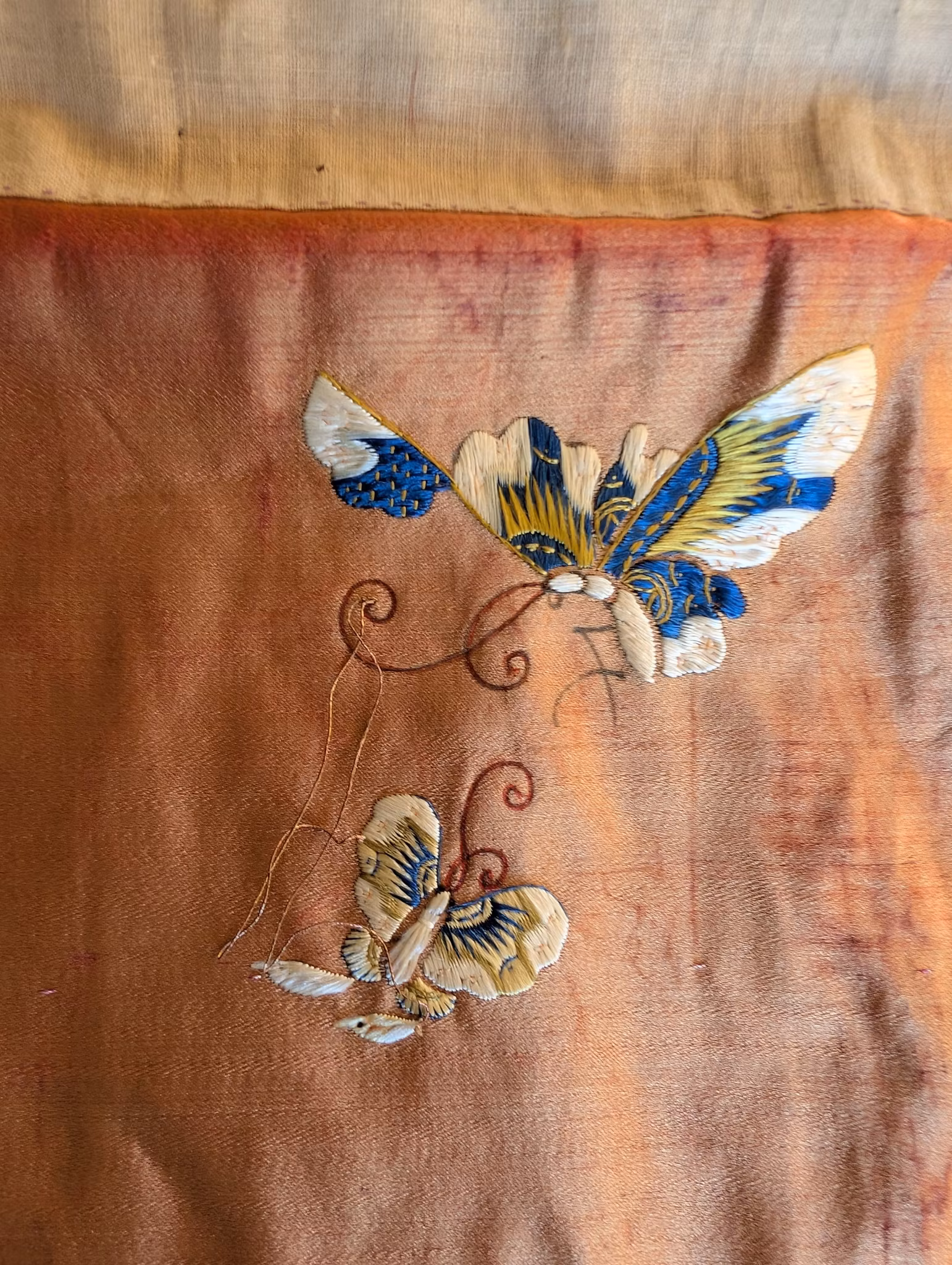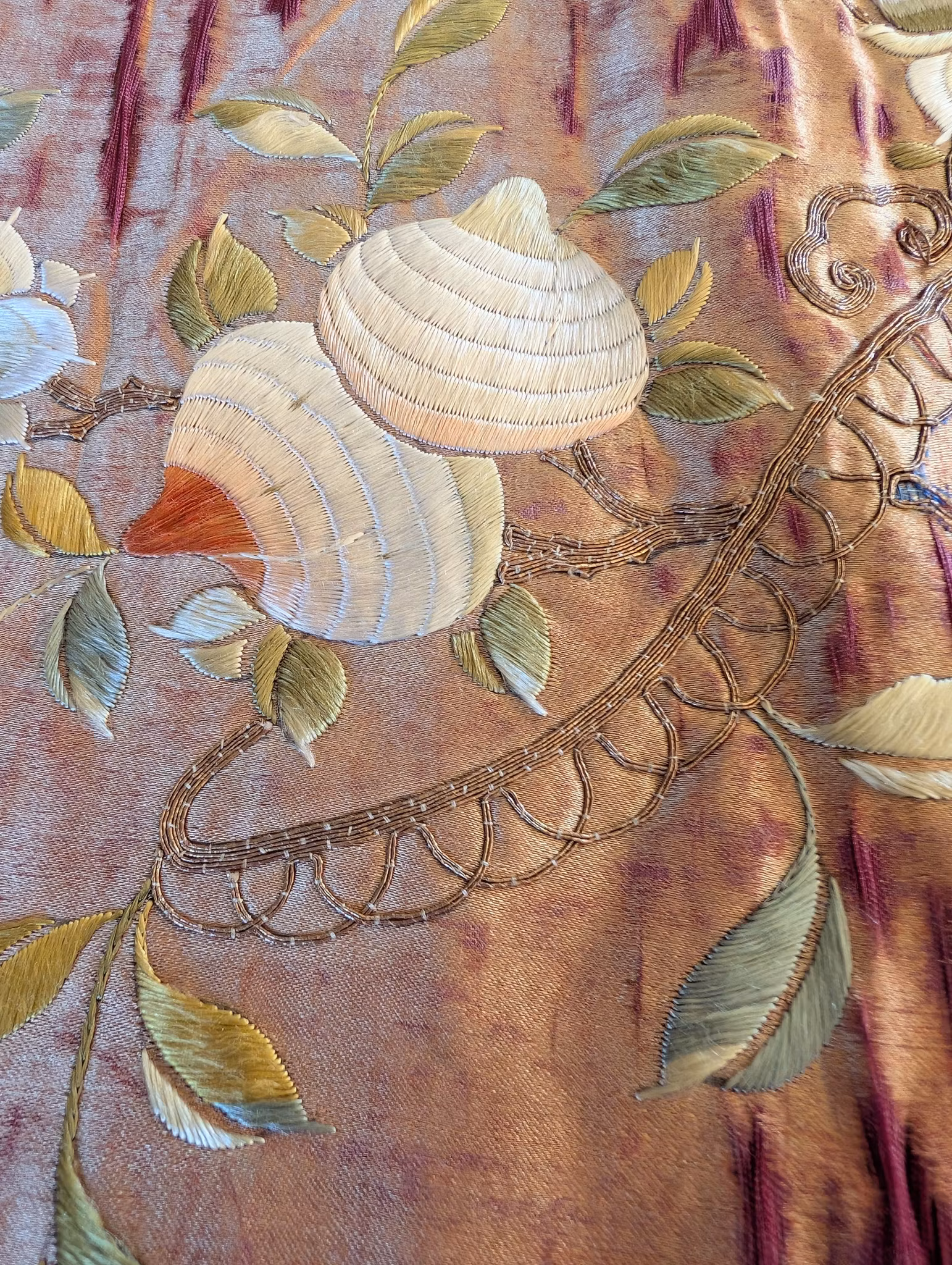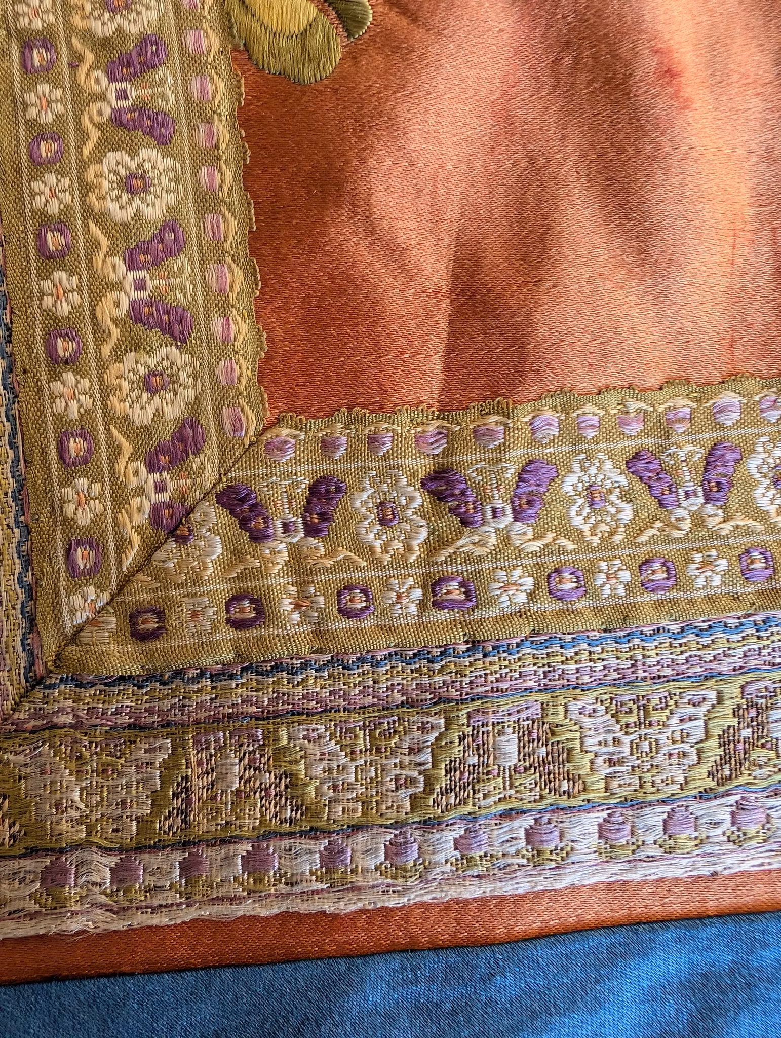 Beautiful large silk embroidery of a person riding a Qilin in the center 麒麟送子, surrounded by two other persons and flowers, fruits and butterflies.