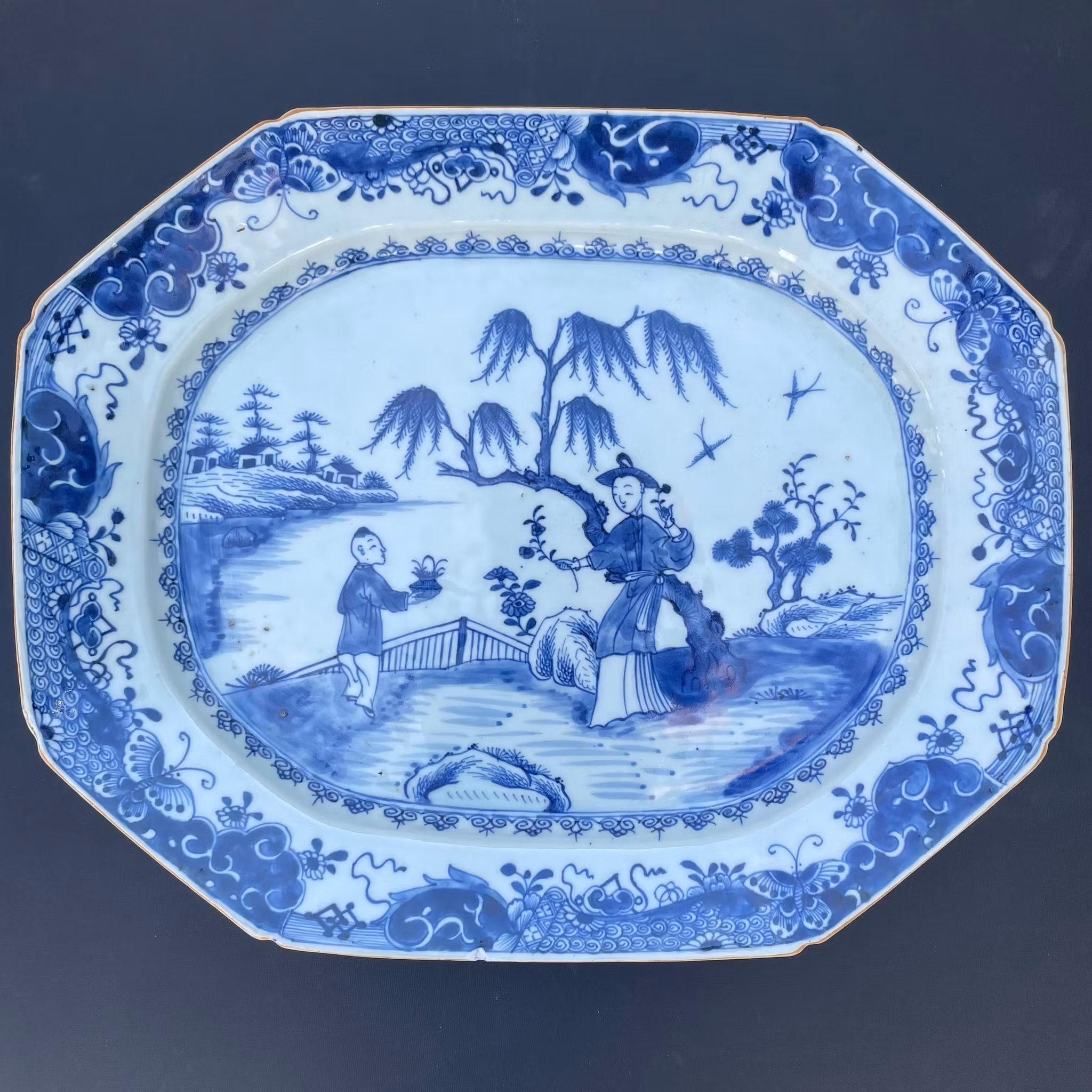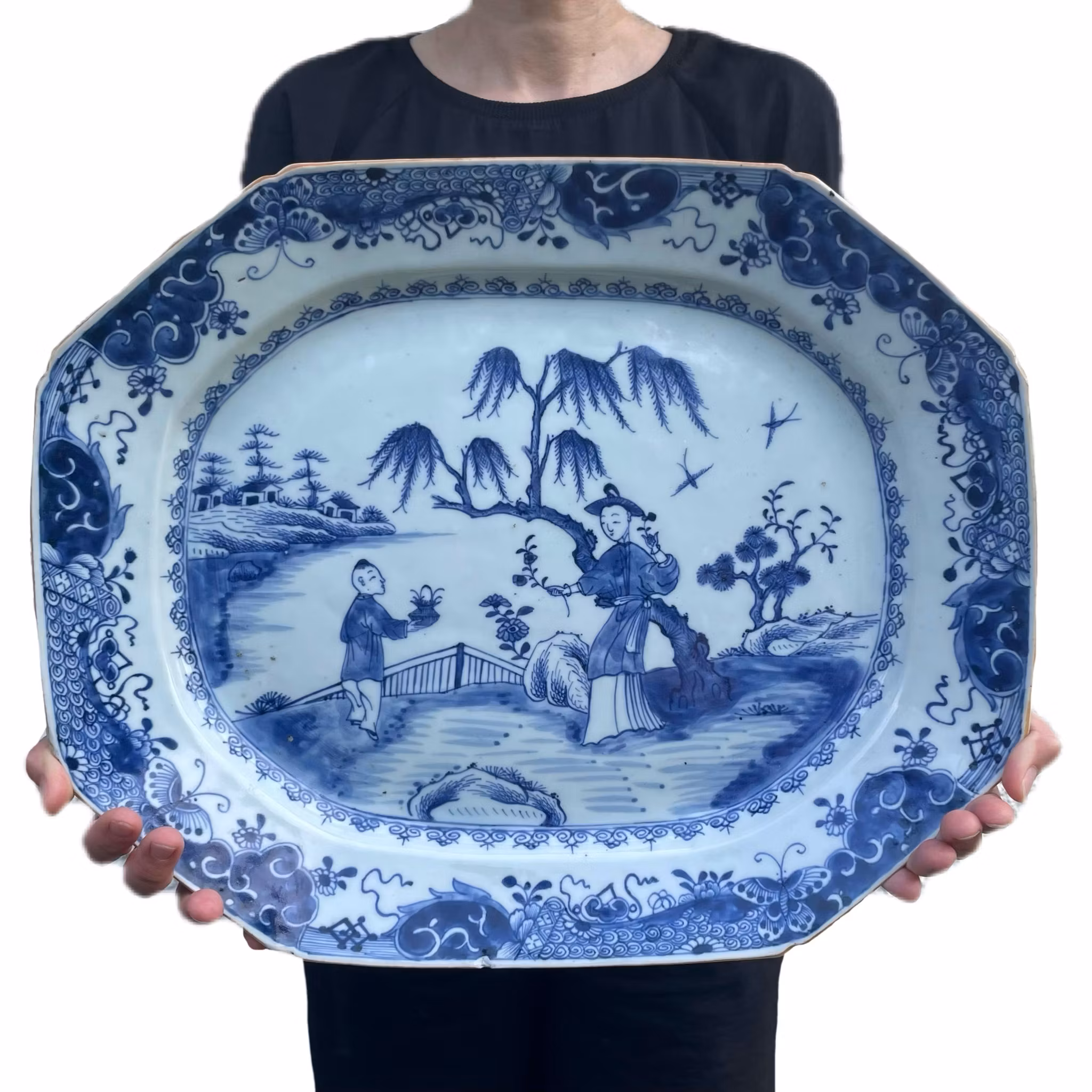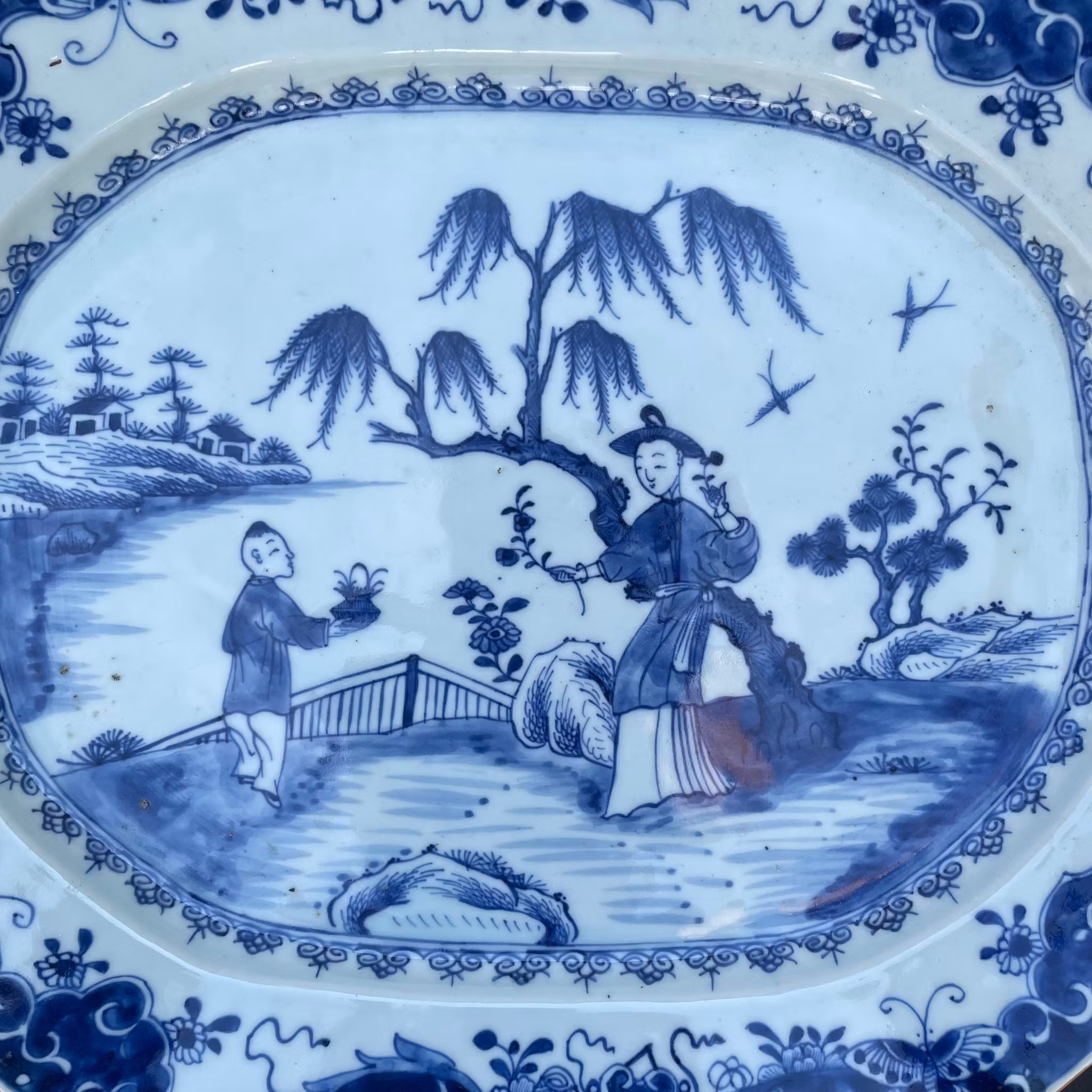 A very large platter decorated with figure scenes, nice quality and crisp blue cobalt. 18th century, Qianlong period