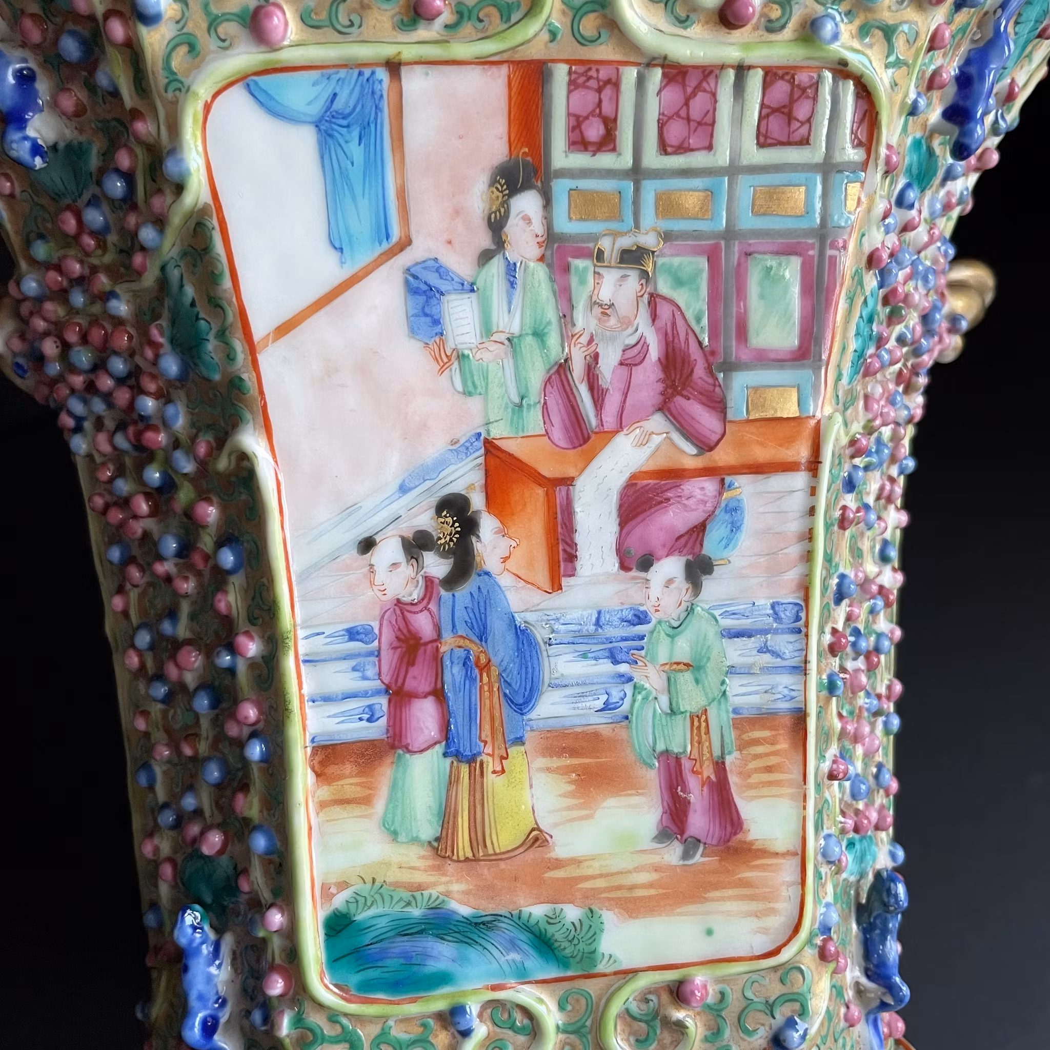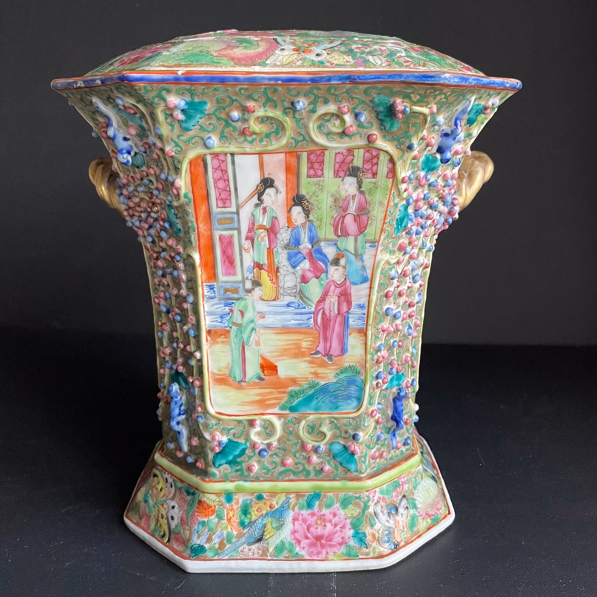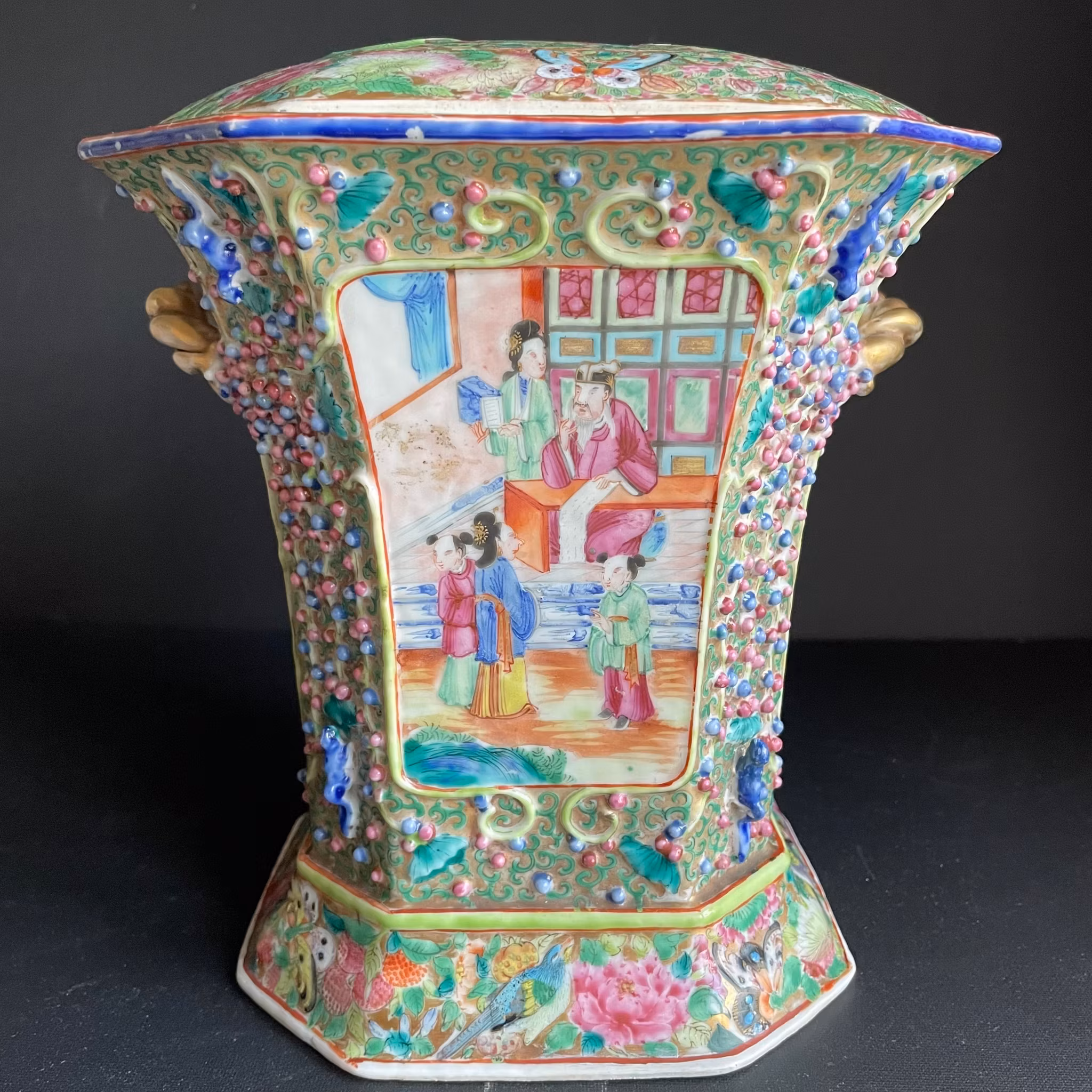 This Chinese rose mandarin bough pot / tulip vase is decorated with scenes of mandarin characters, relief animals, and relief floral designs. It has nice color and is highlighted with gold gilt. The base of the pot is decorated with colorful designs including butterflies and flowers