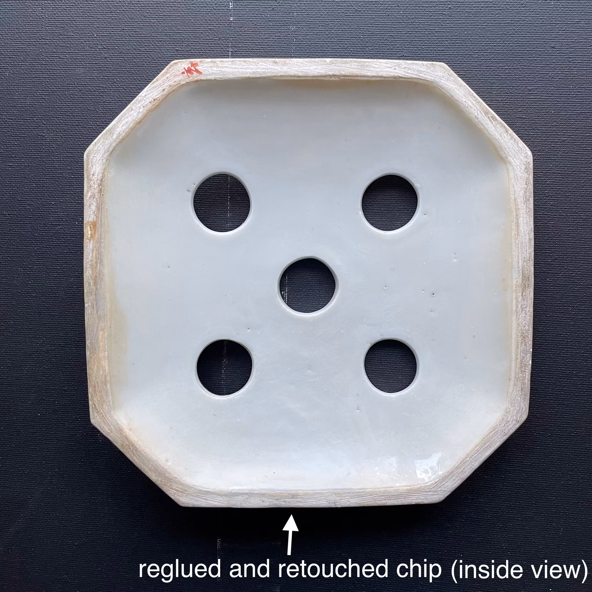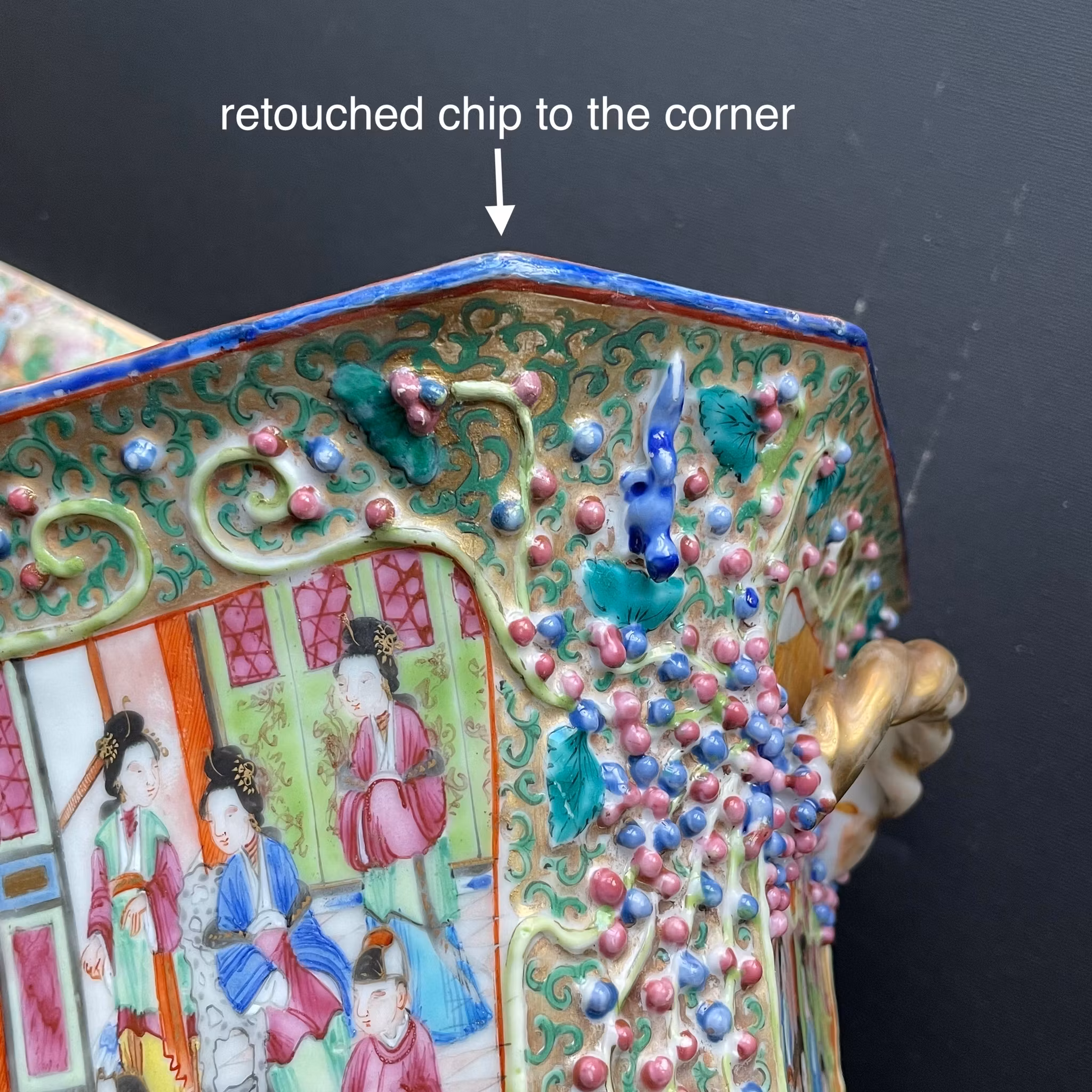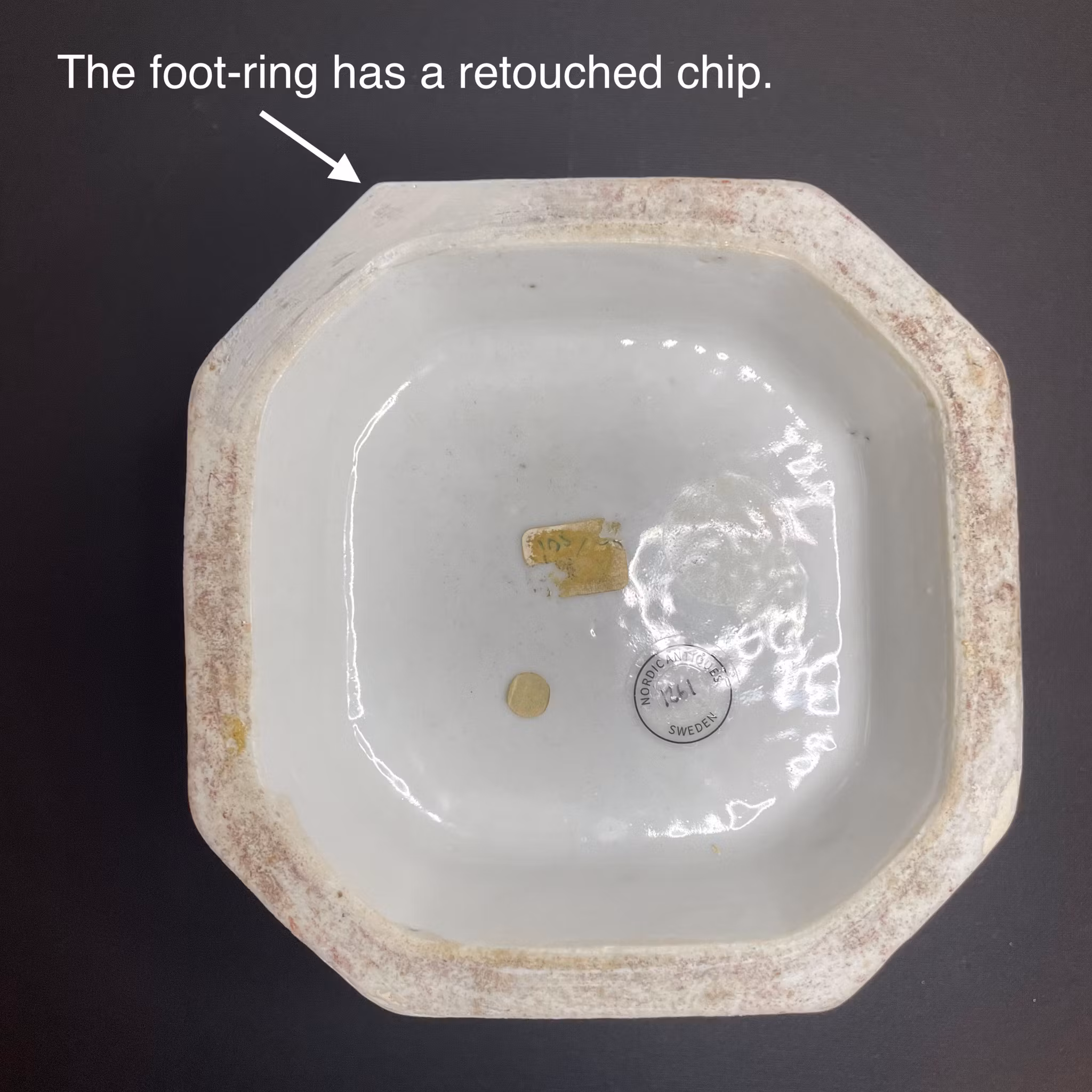 Checked with UV light. The pot have a retouched hairline to the side going from the top downwards (not reaching the bottom), one retouched chip to the corner of the pot. Foot ring of the pot have a retouched chip. Two mouses/squirrels of the pot has got retouch. The lid has got a reglued and retouched chip to the rim. Micro nicks and frittings, general wear and manufacturing flaws. Although it got some issues, the restoration is very professional and does not impact usage or viewing at all.