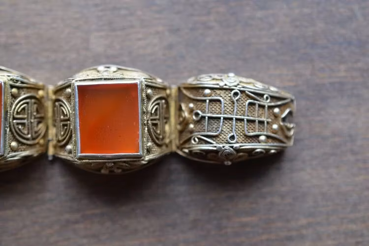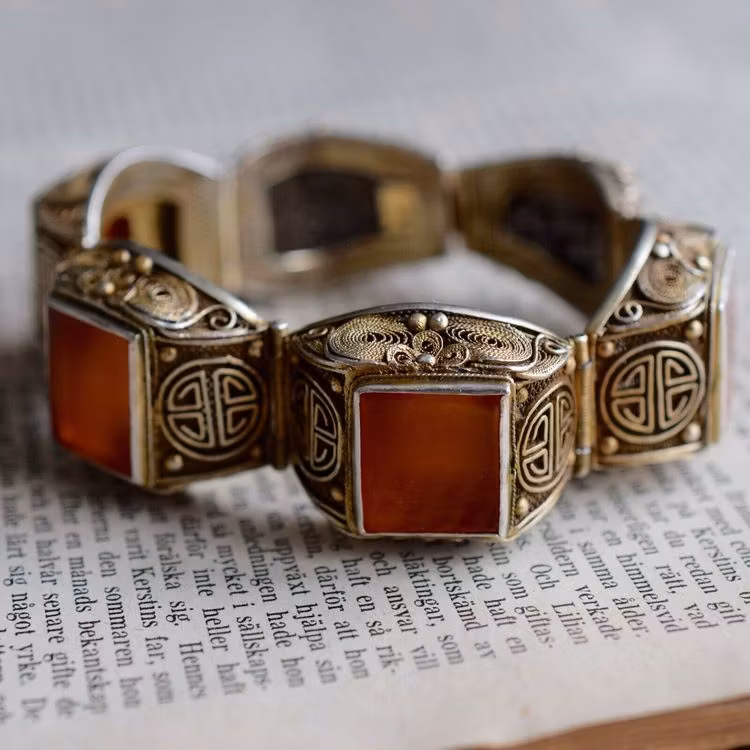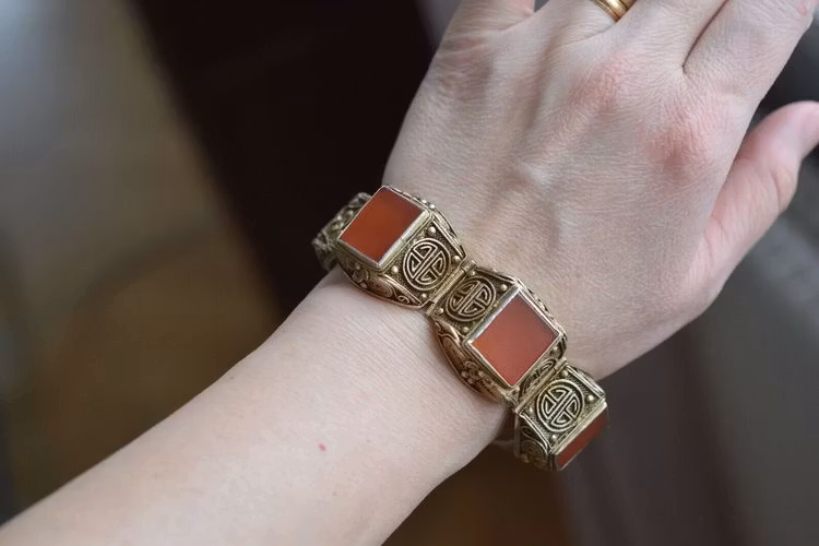 Chinese filigree handmade gilded sterling silver bracelet with natural agate