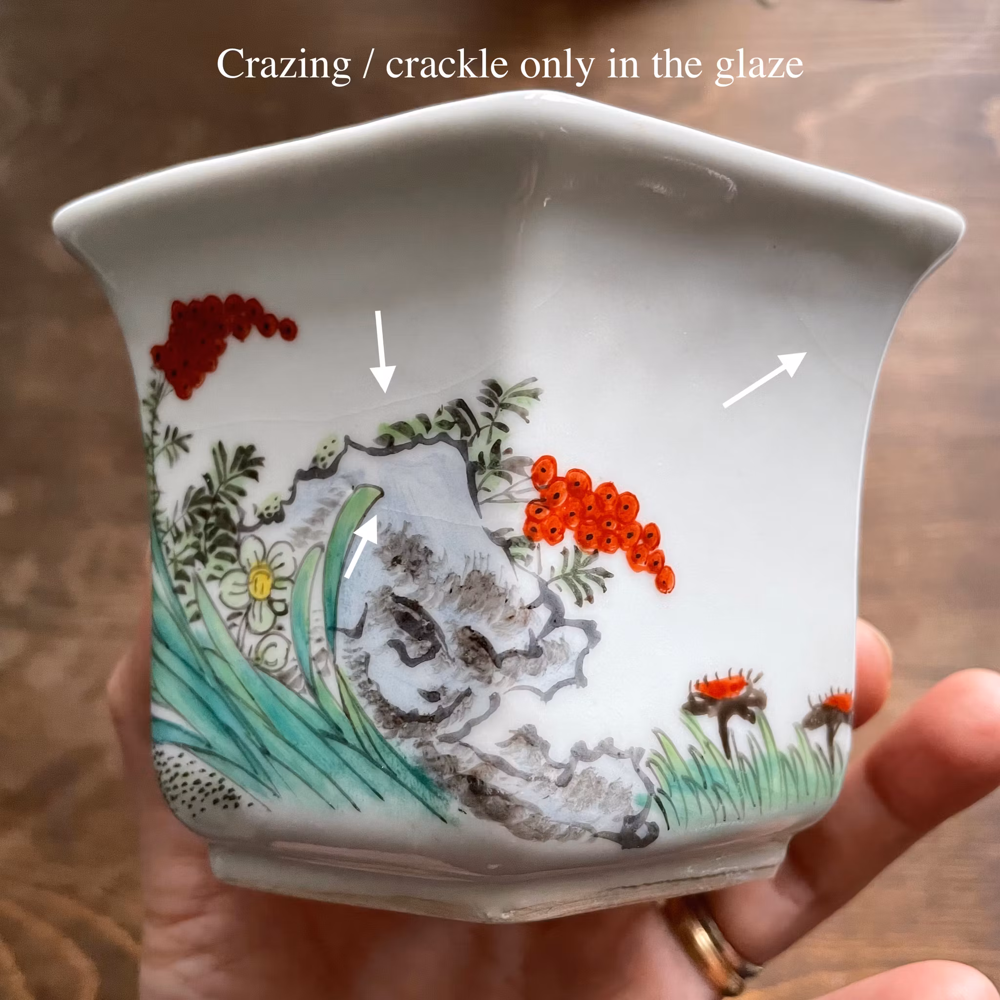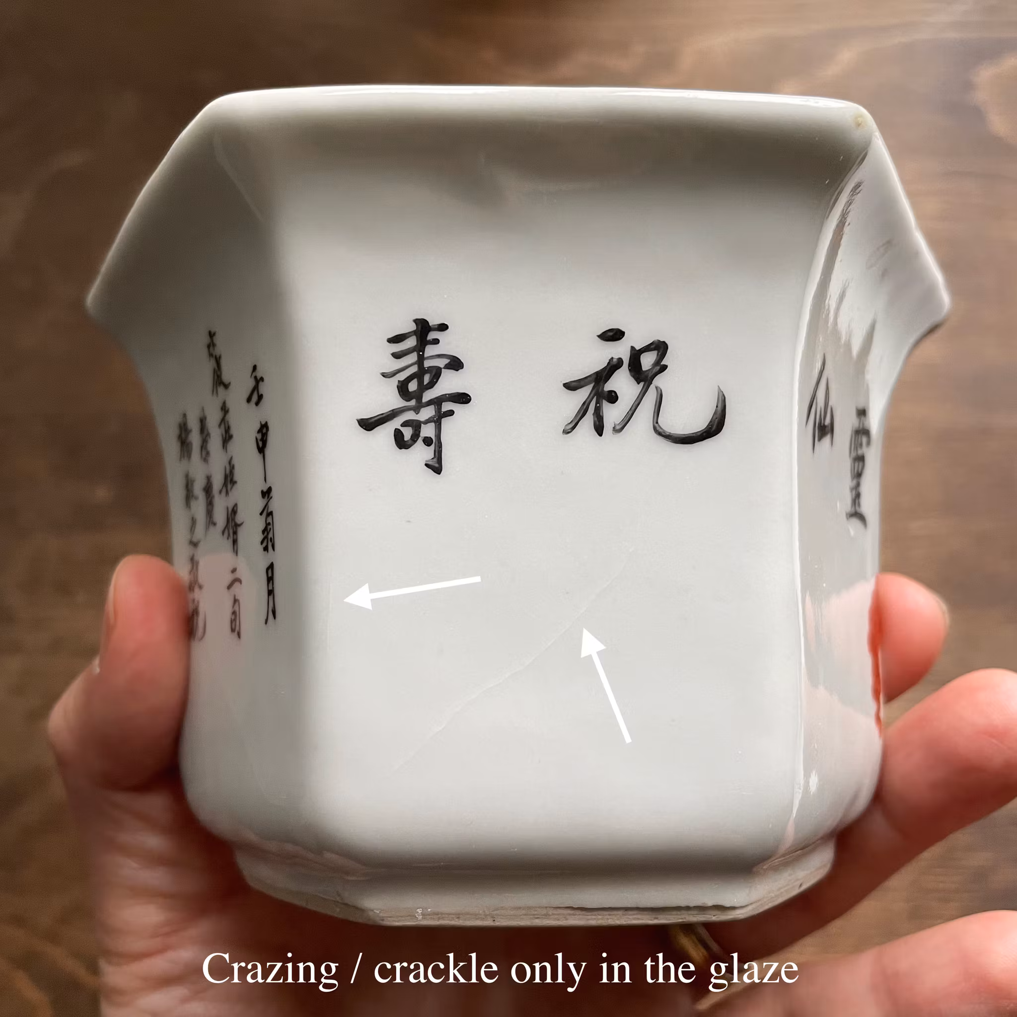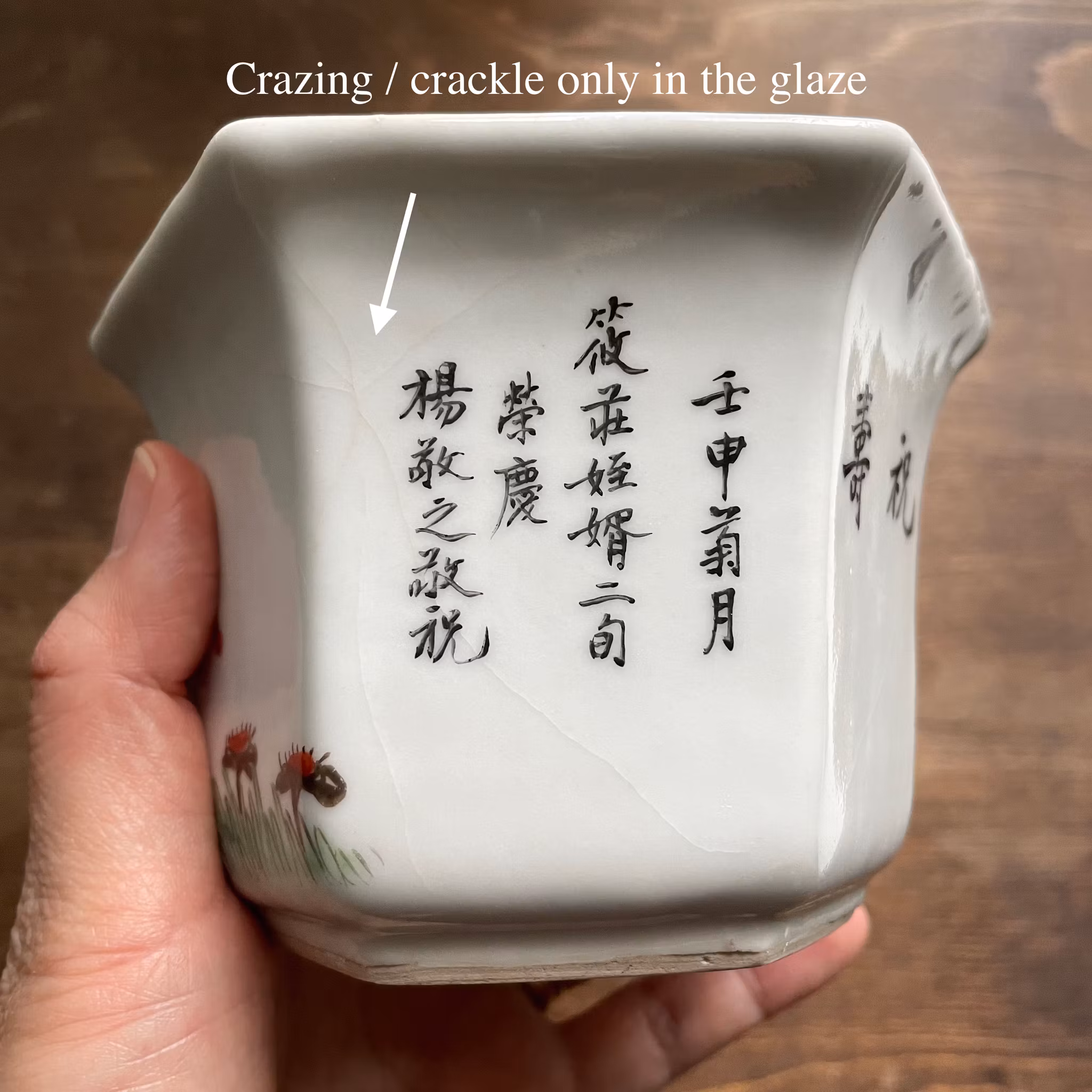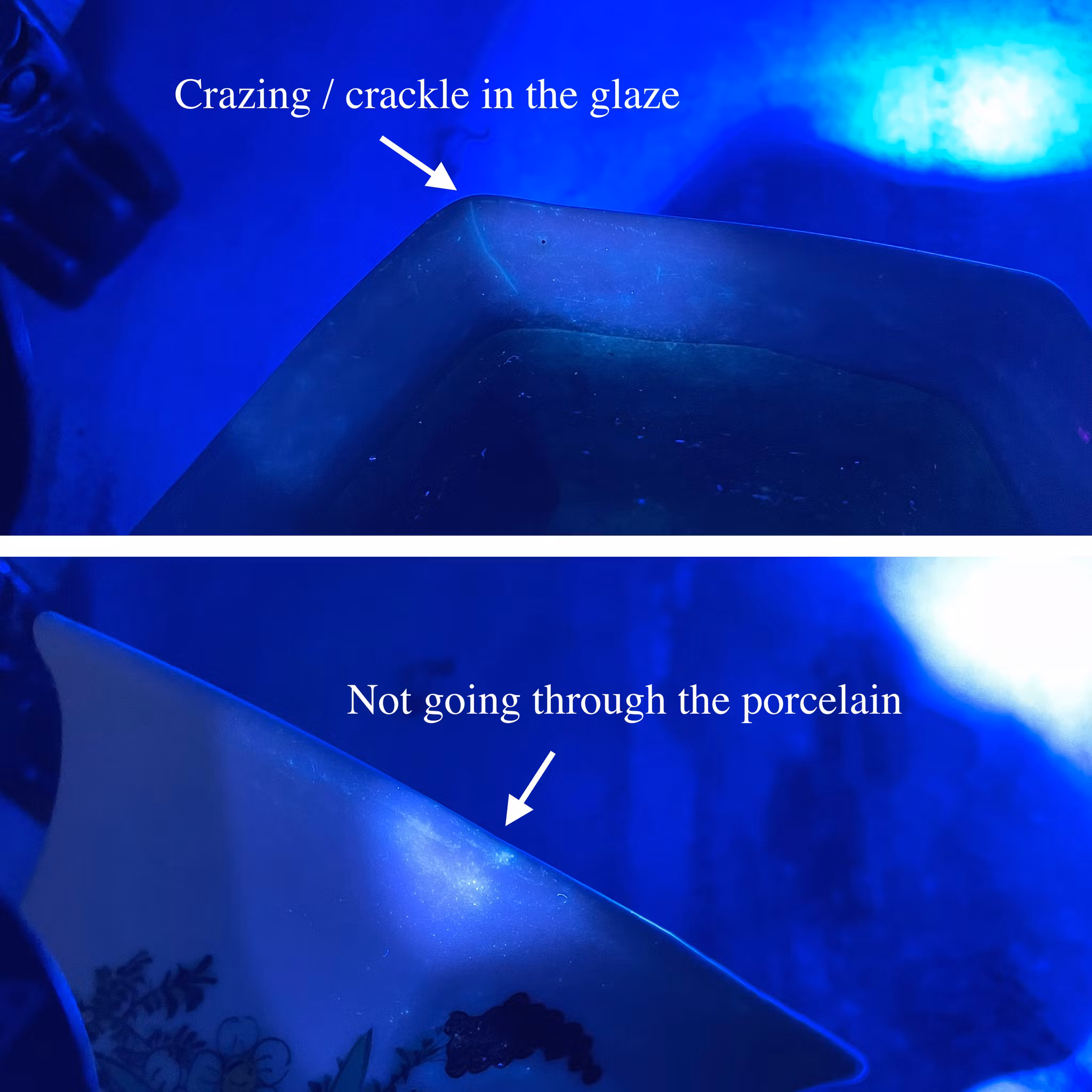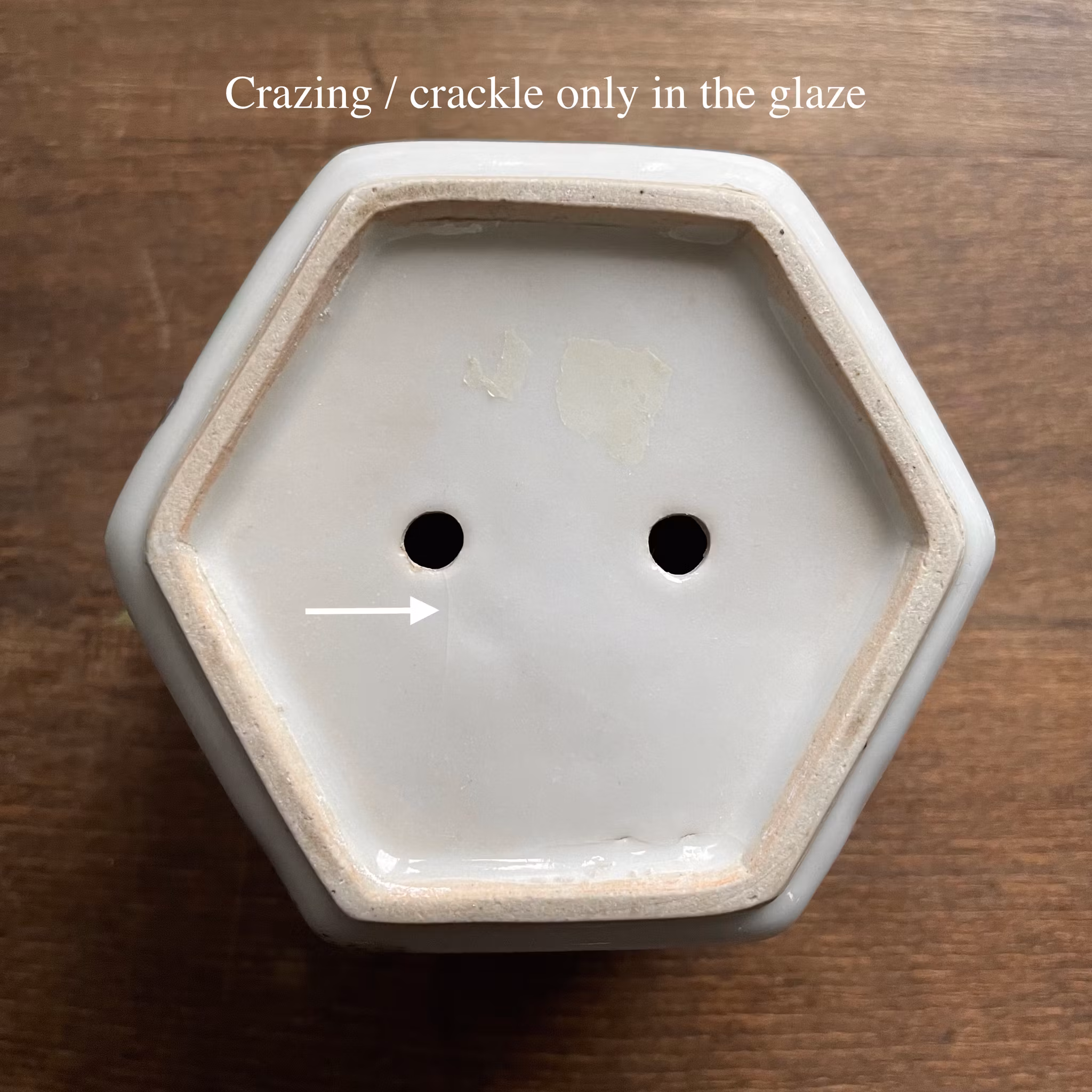 Checked with UV Light. No hairline, No crack. The planter have crazing and crackle in the glaze in many places. These crackles are not going through the porcelain, only on the surface. Checked with UV light.