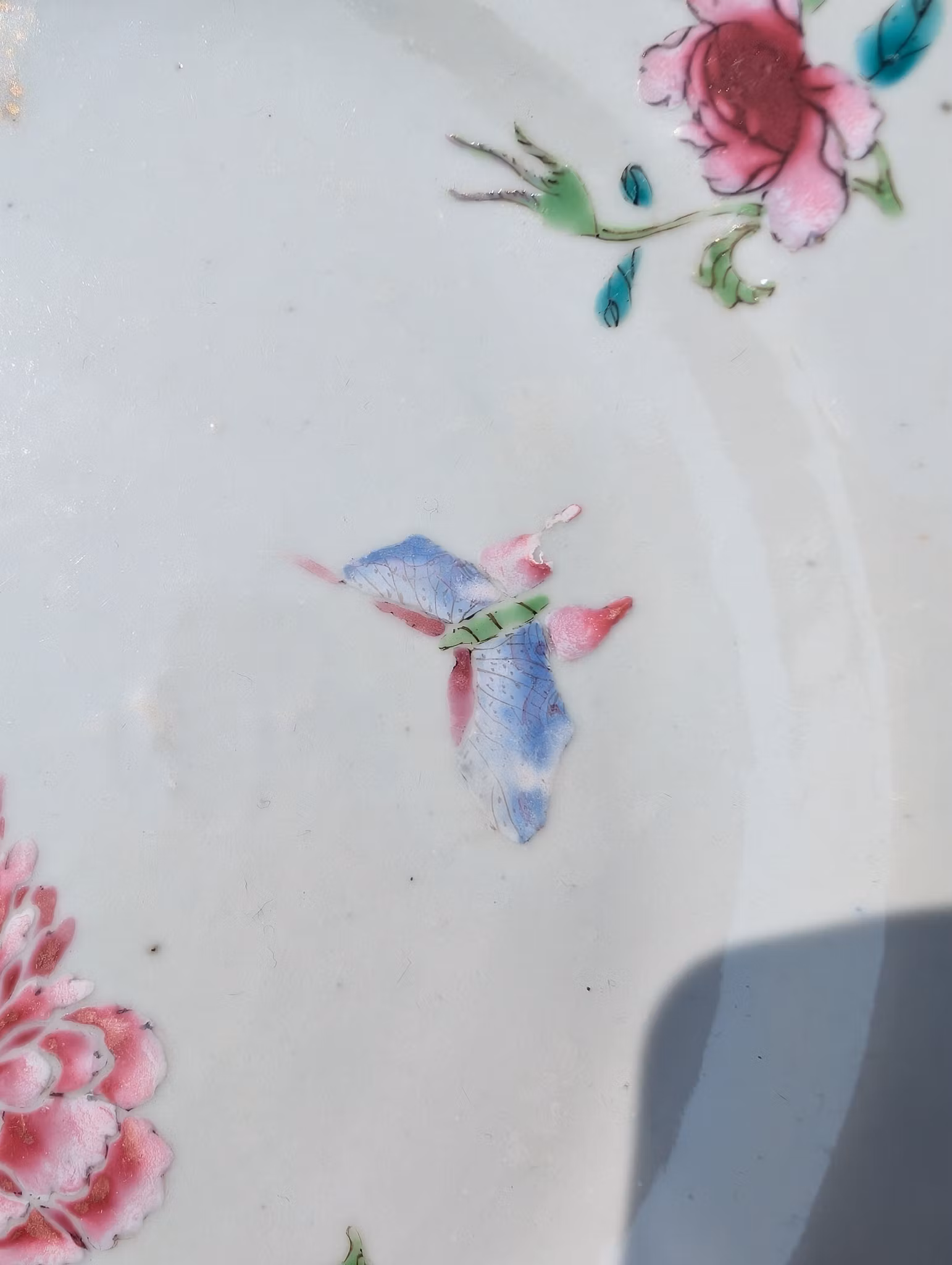 Early 18th century famille rose plate with beautiful decoration of two butterflies and flower. Lovely design and use of empty space by the artist.
