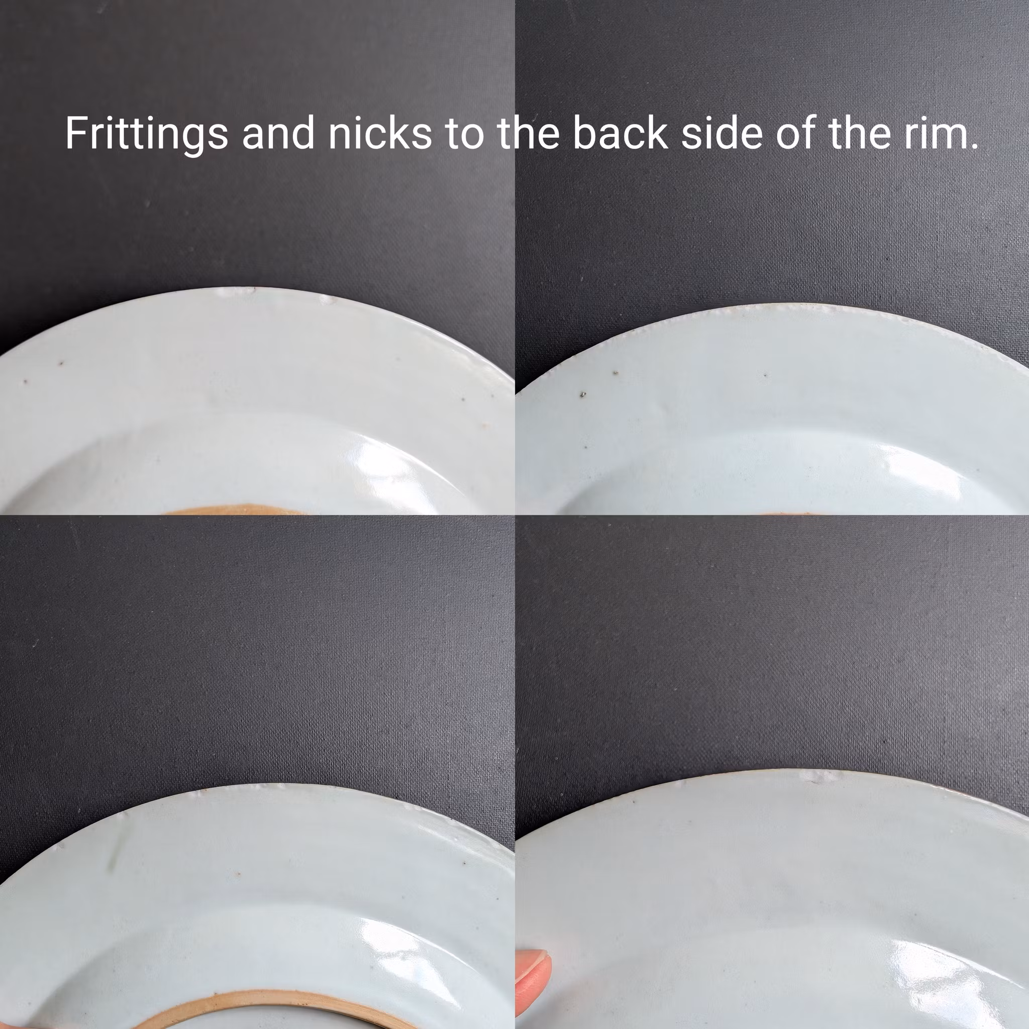 Checked with UV Light. No hairline, no crack, no restoration. Some minor nicks/ frittings to the rim ( not visible on the front side) . Glaze wear. Some manufacturing / firing flaws in the porcelain paste.