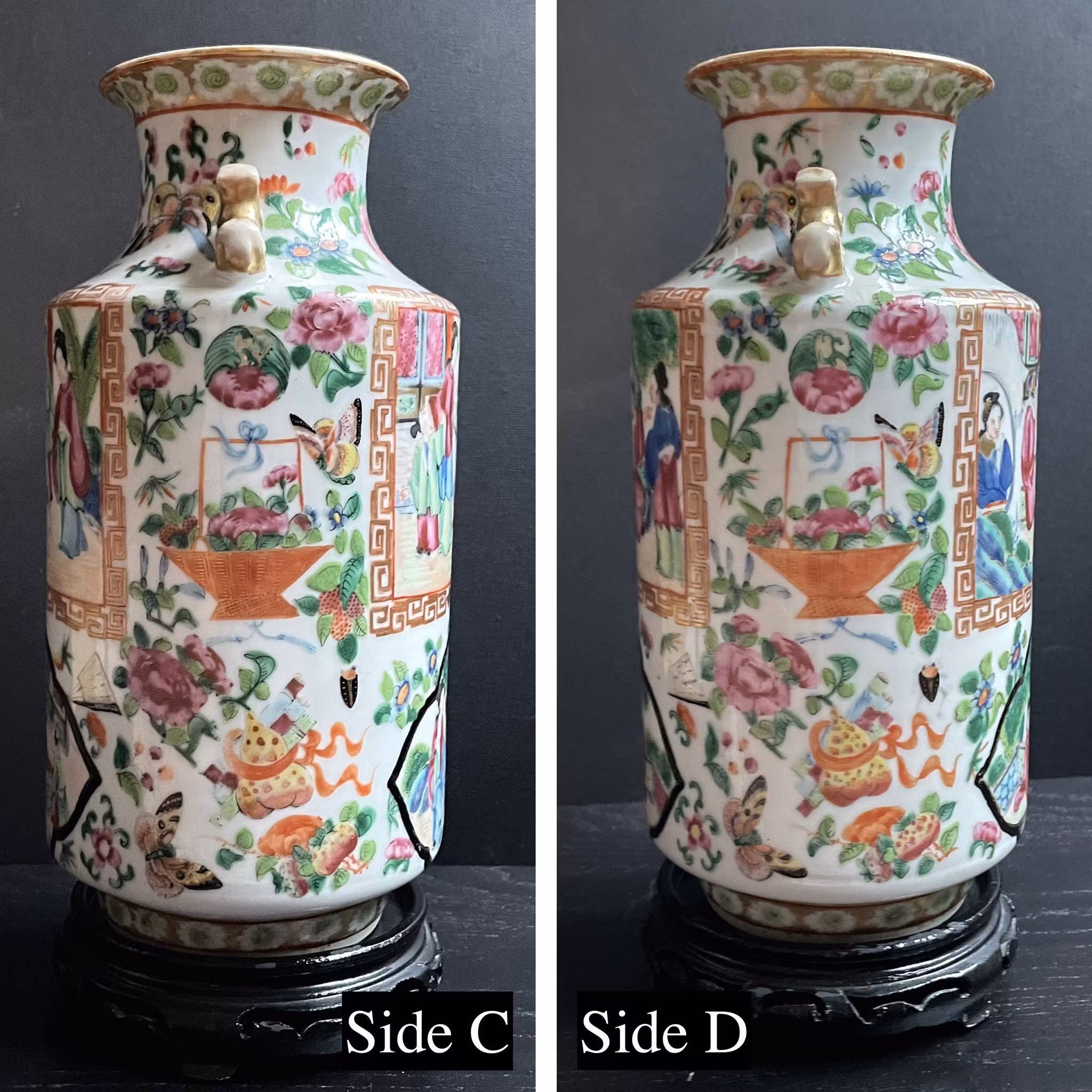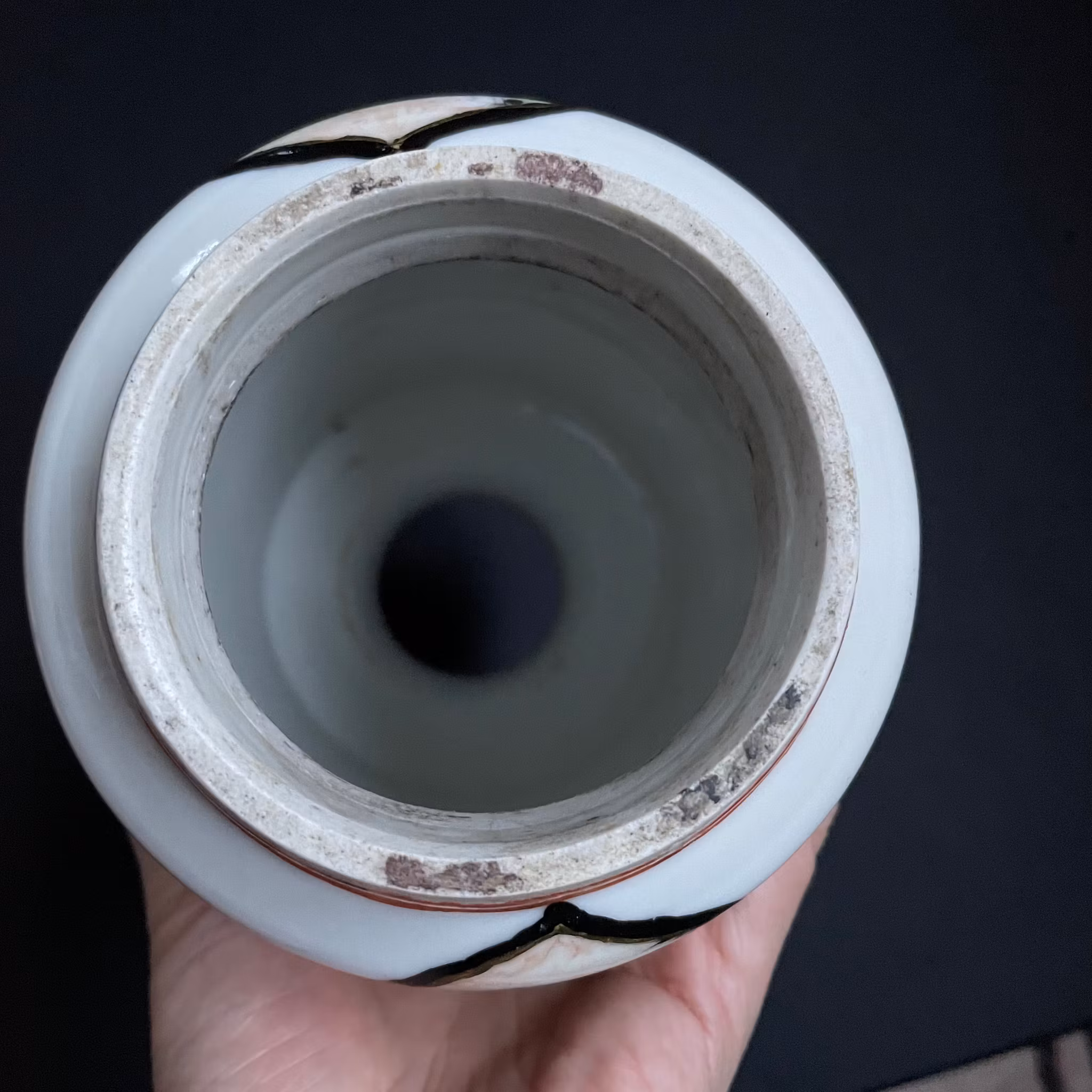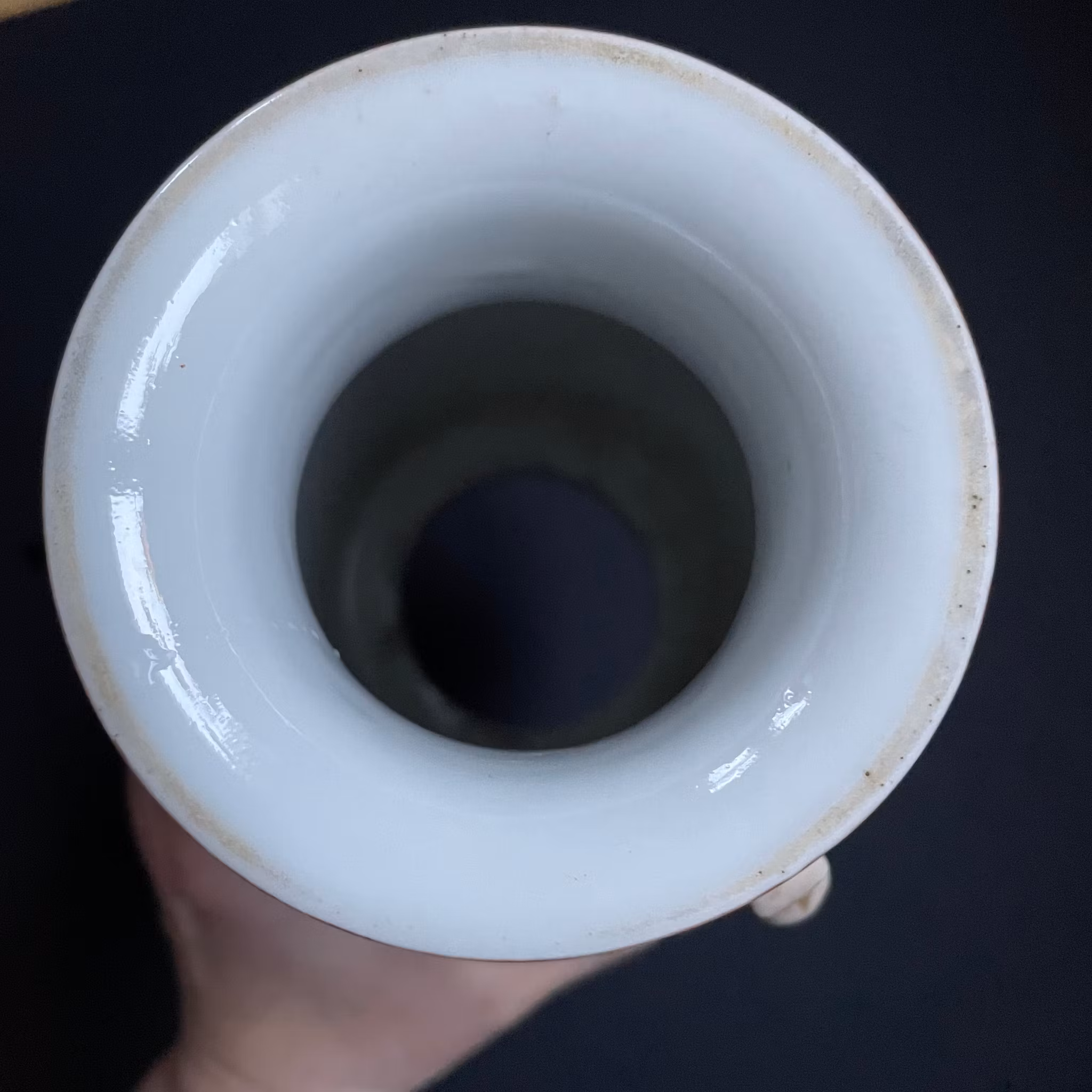 The vase have probably been remade to a lamp at some point, the bottom of the vase is cut out and missing. The top rim slightly polished and with some glaze loss. No cracks or hairlines. General wear.