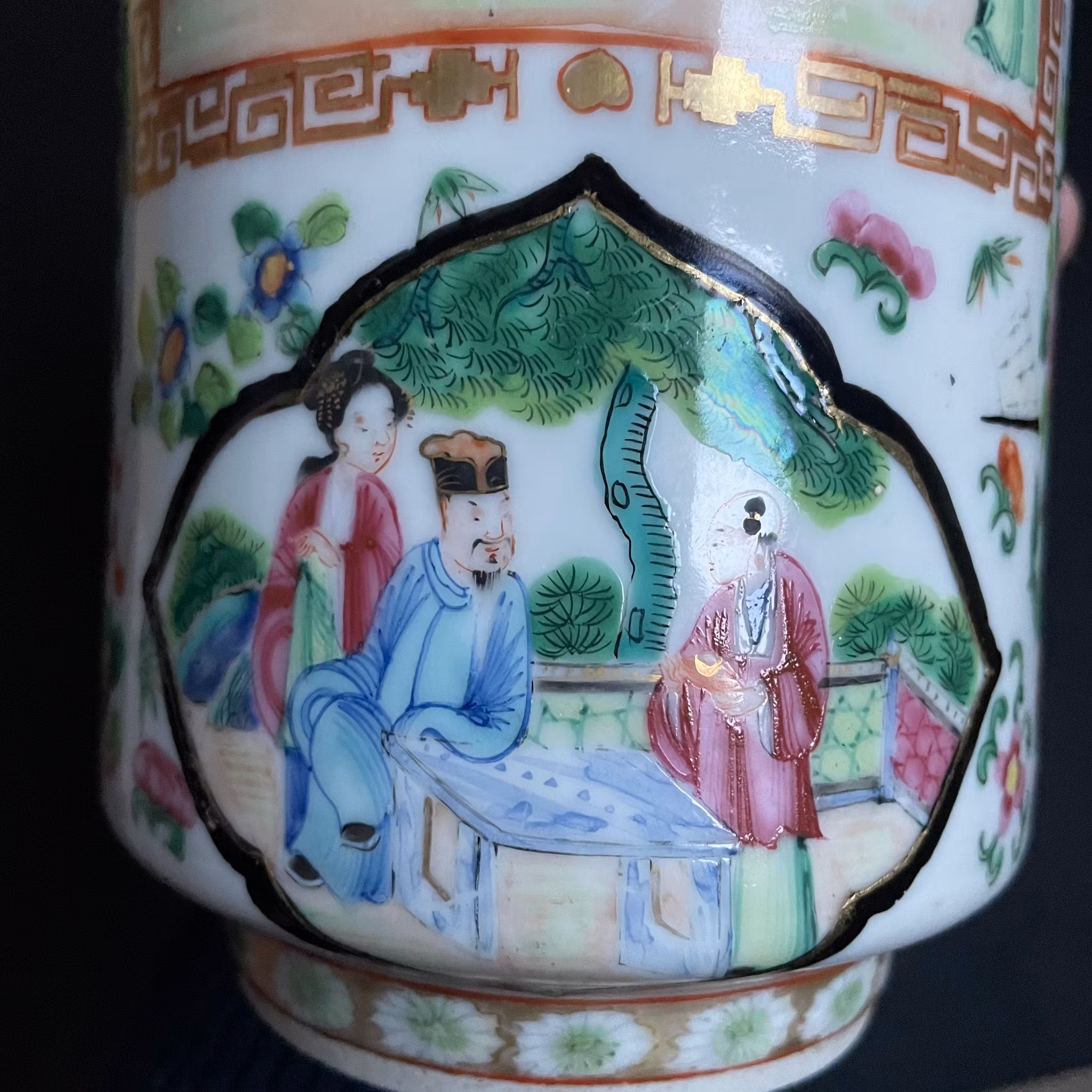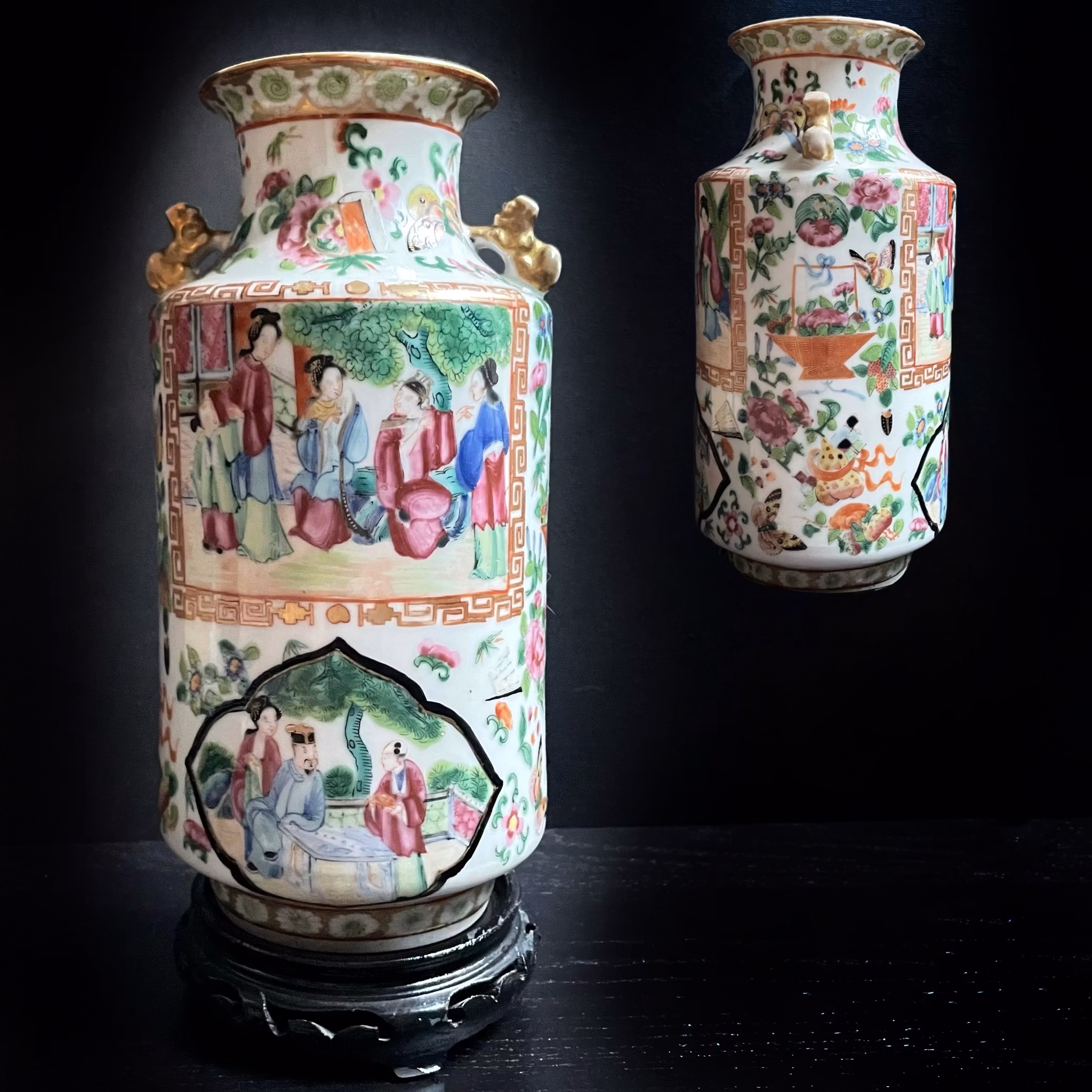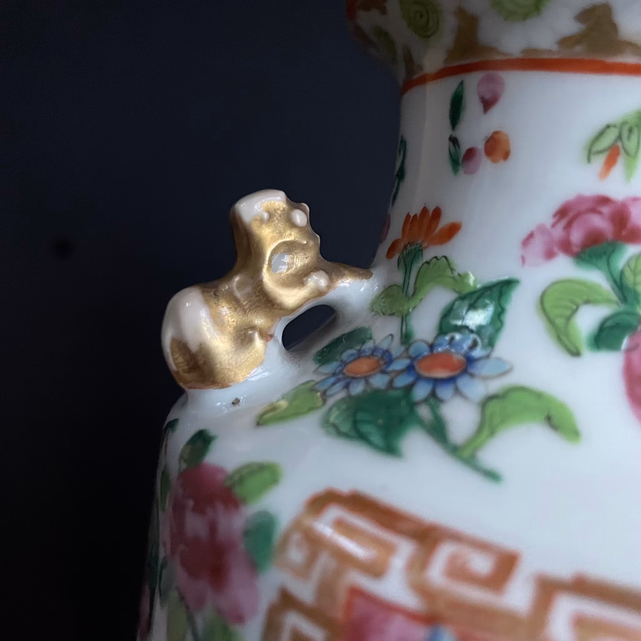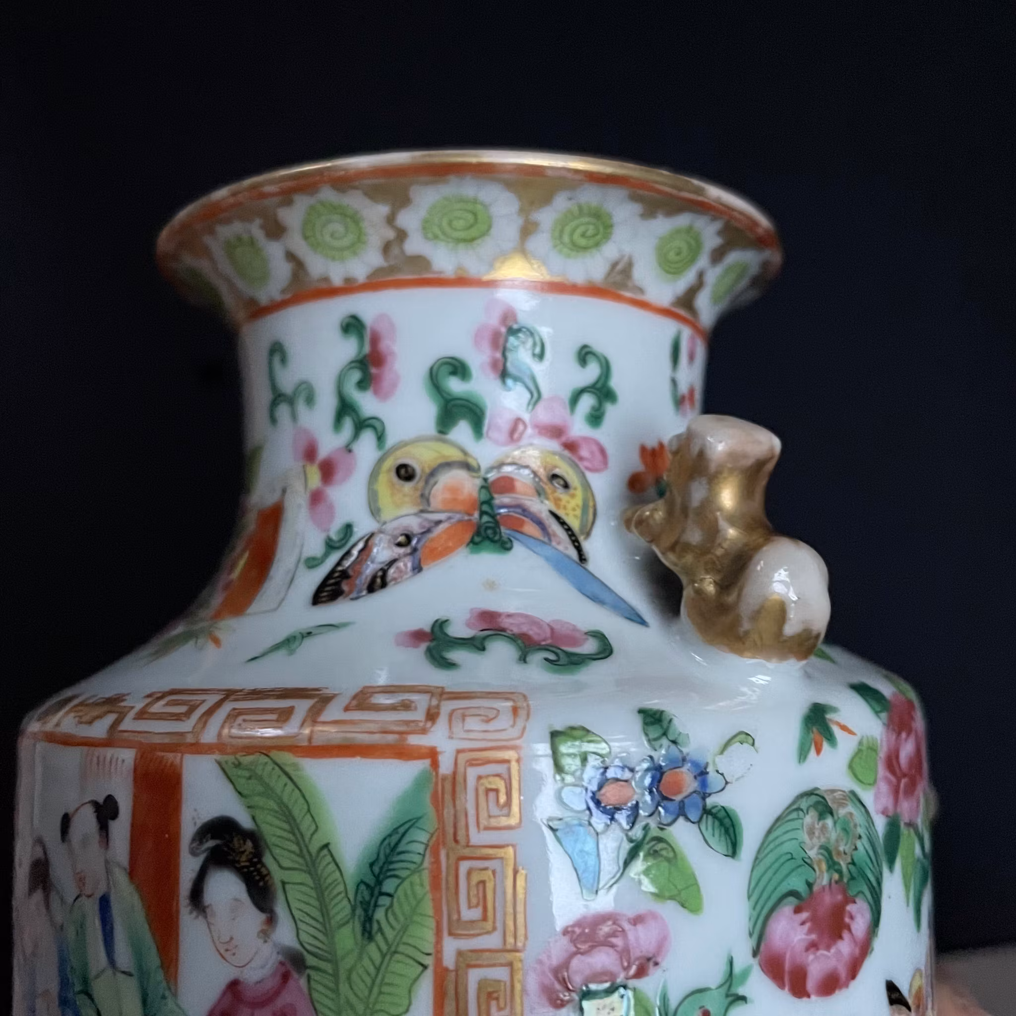 The vase have probably been remade to a lamp at some point, the bottom of the vase is cut out and missing. The top rim slightly polished and with some glaze loss. No cracks or hairlines. General wear.