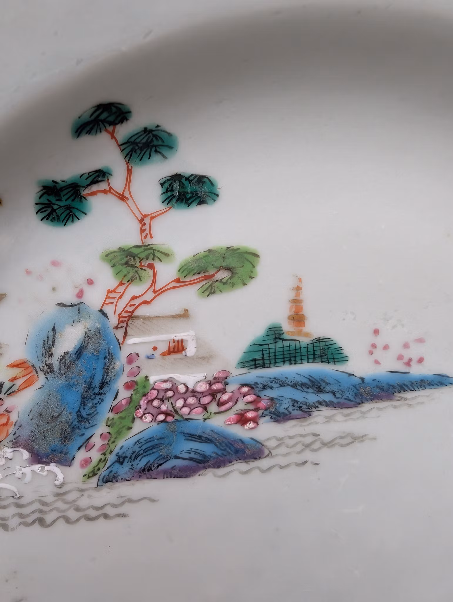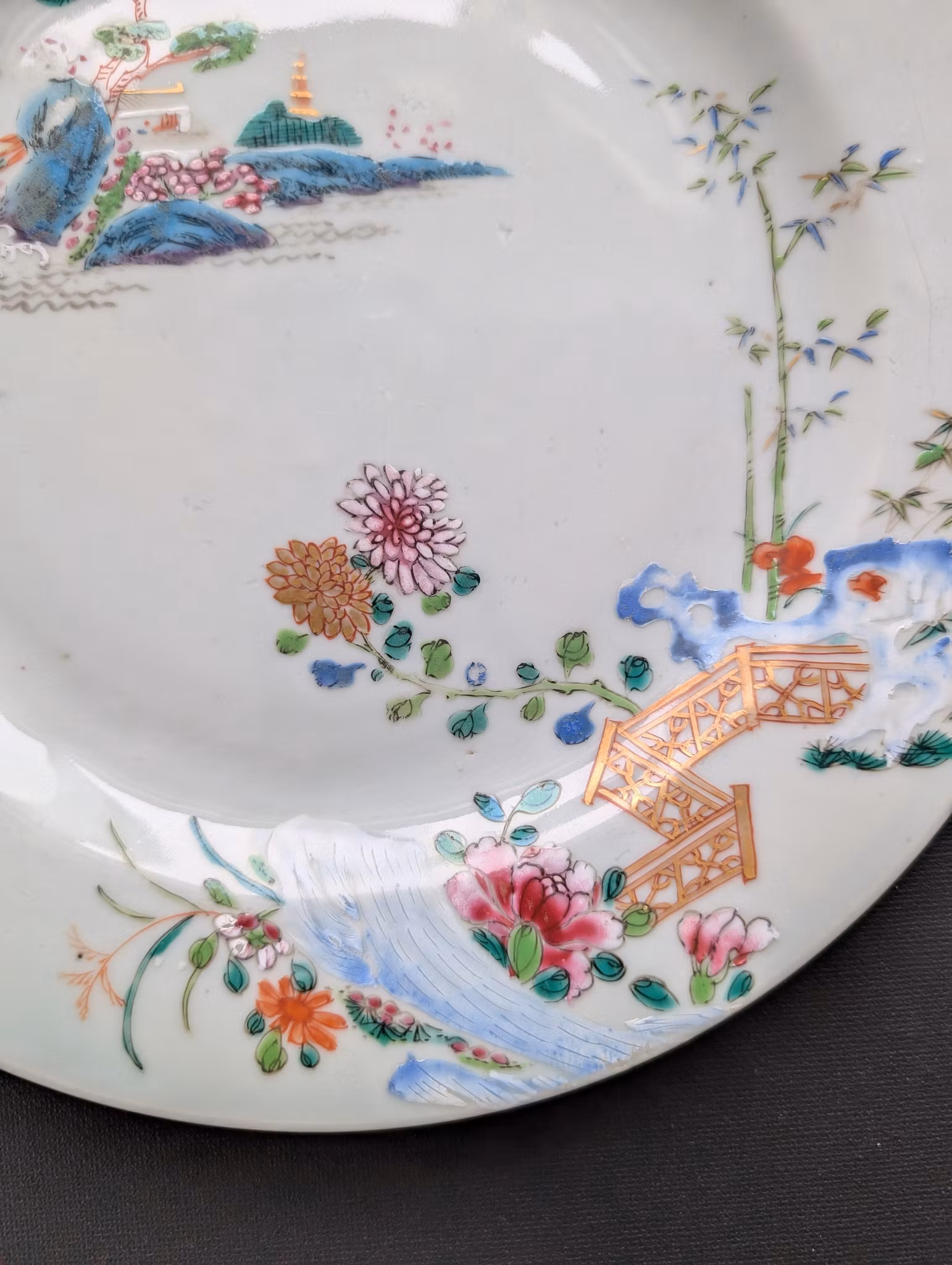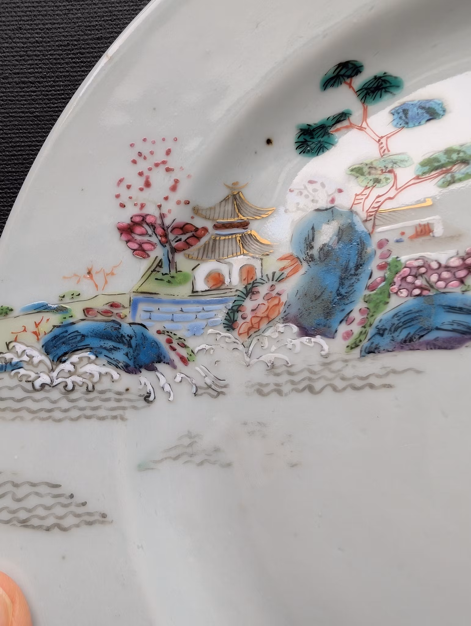 Chinese antique famille rose plate with landscape scenes, Qianlong period #2808