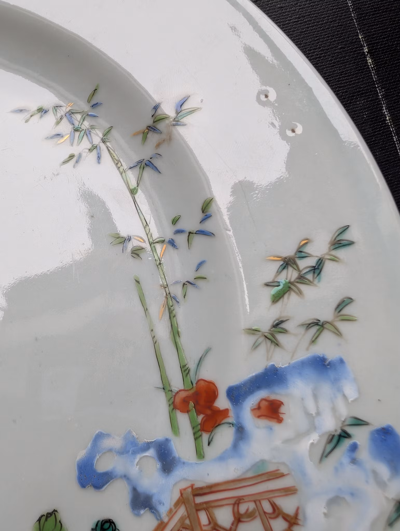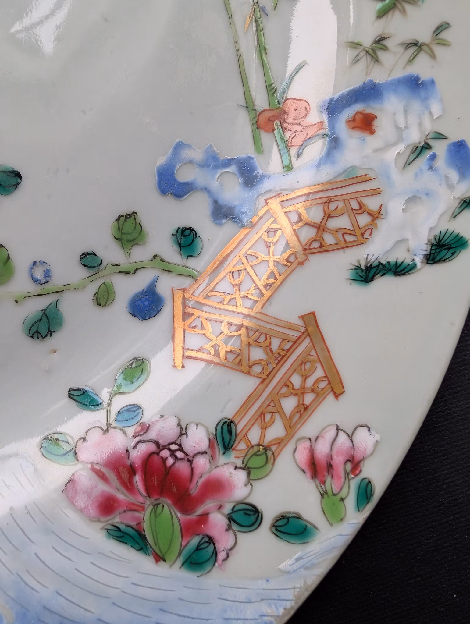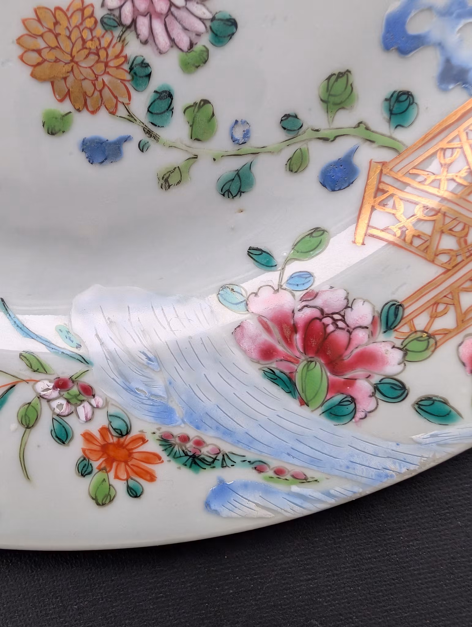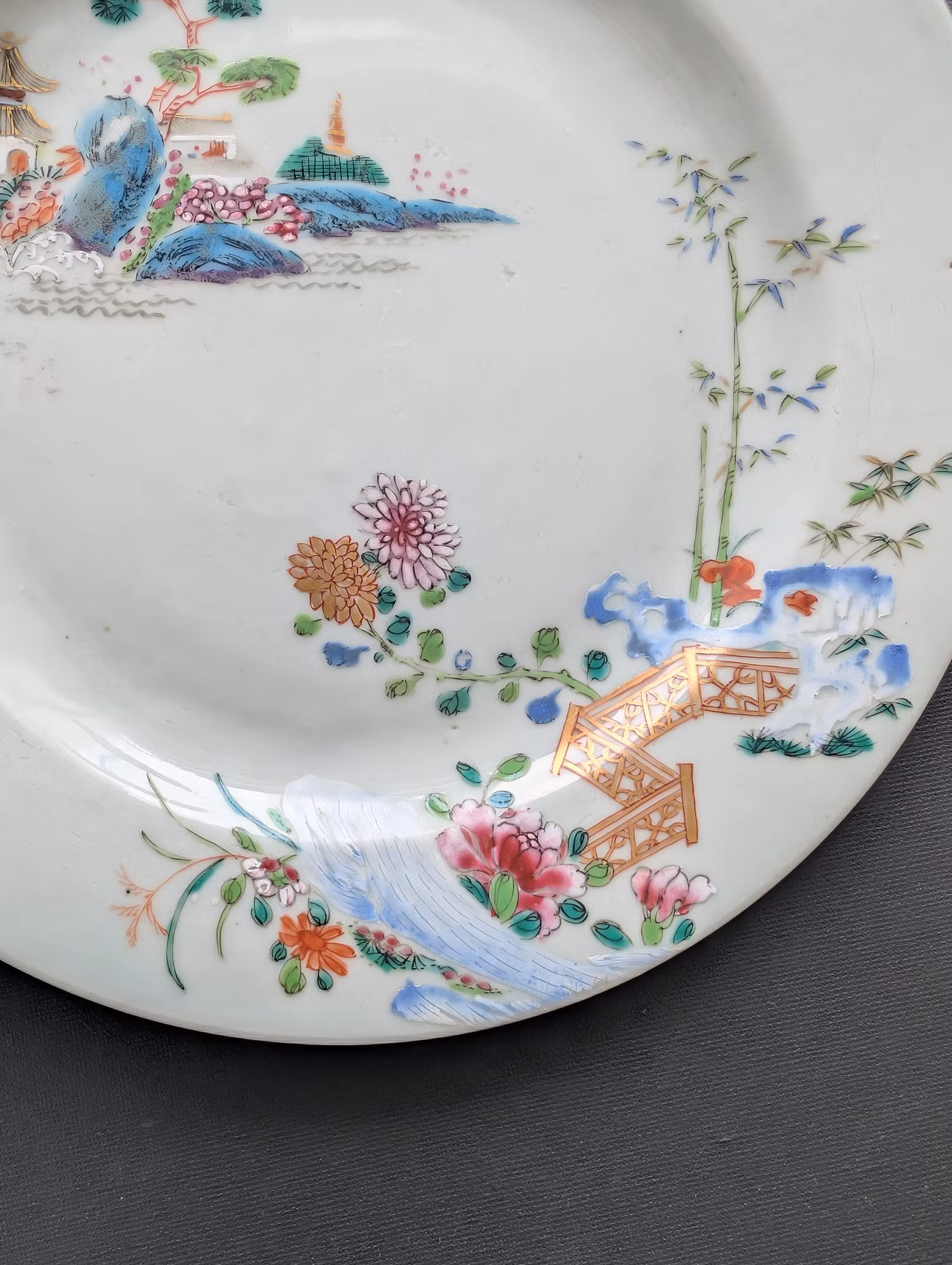 Chinese antique famille rose plate with landscape scenes, Qianlong period #2808