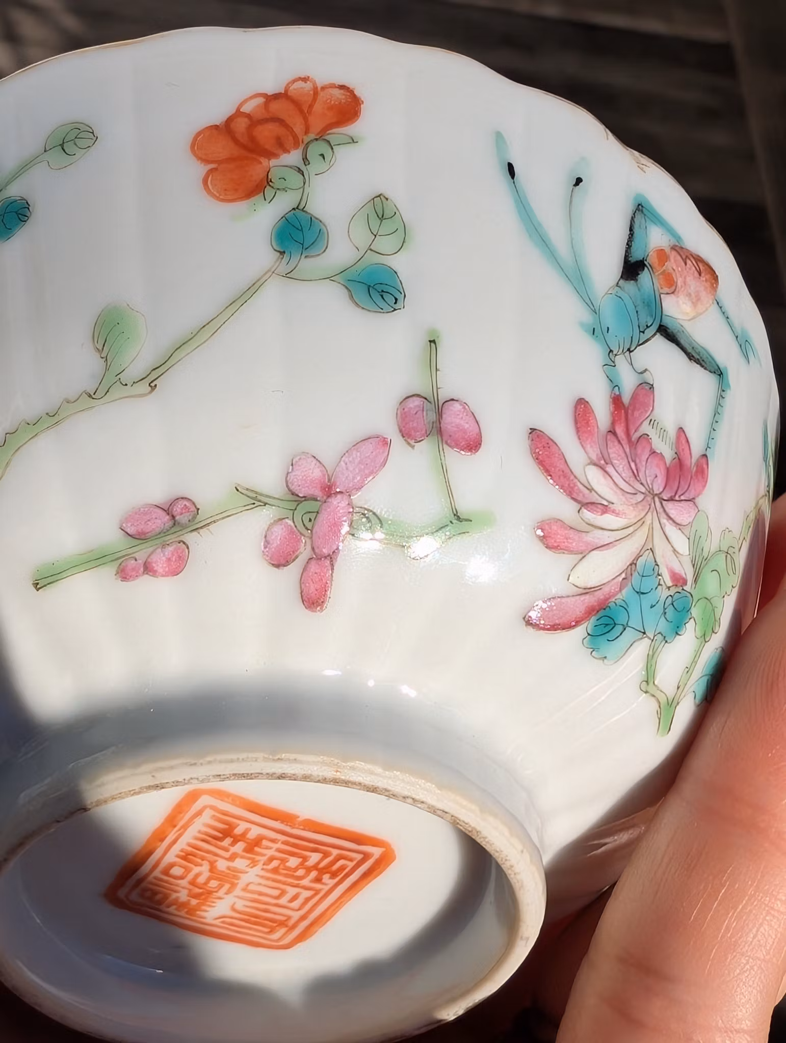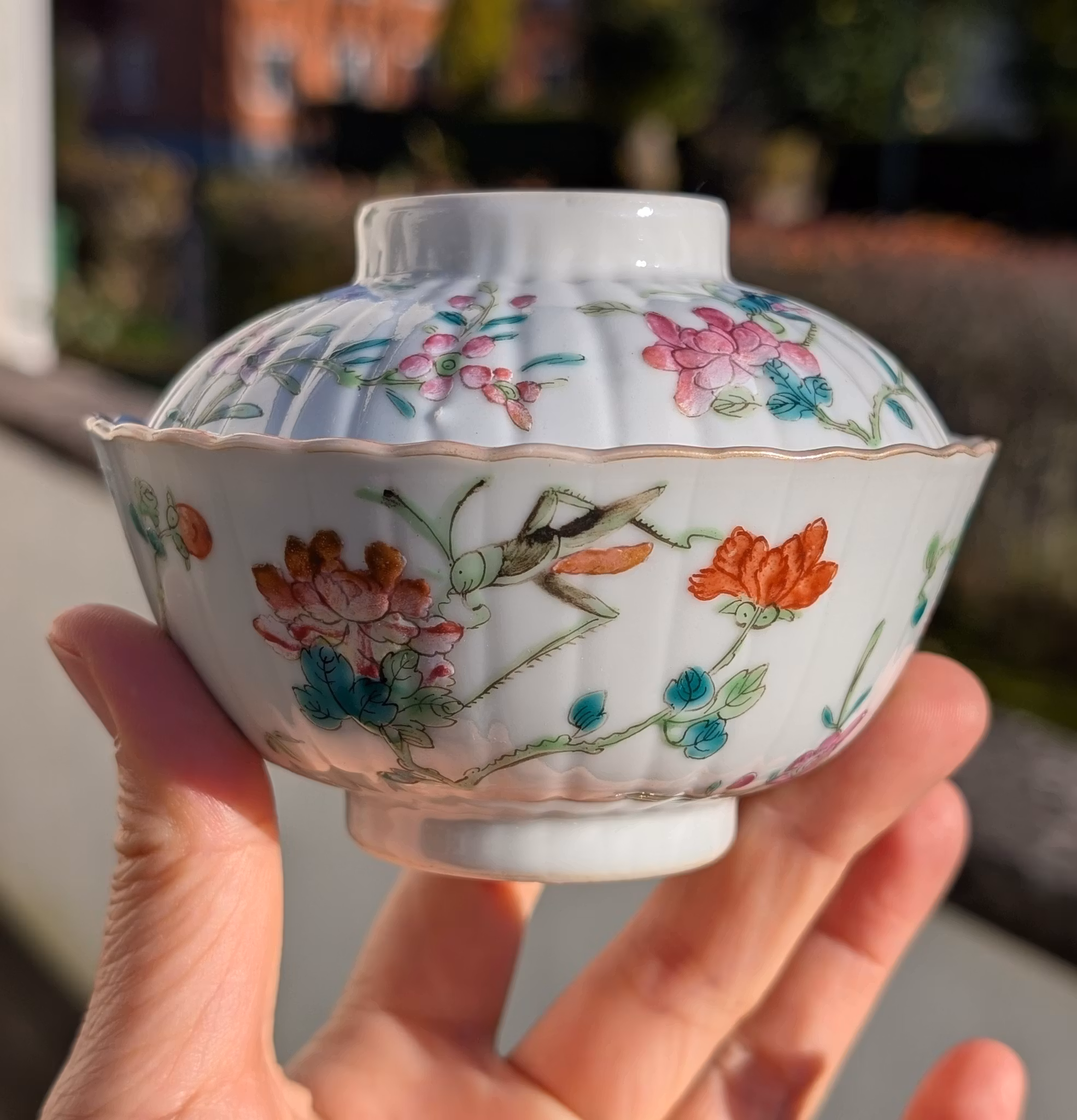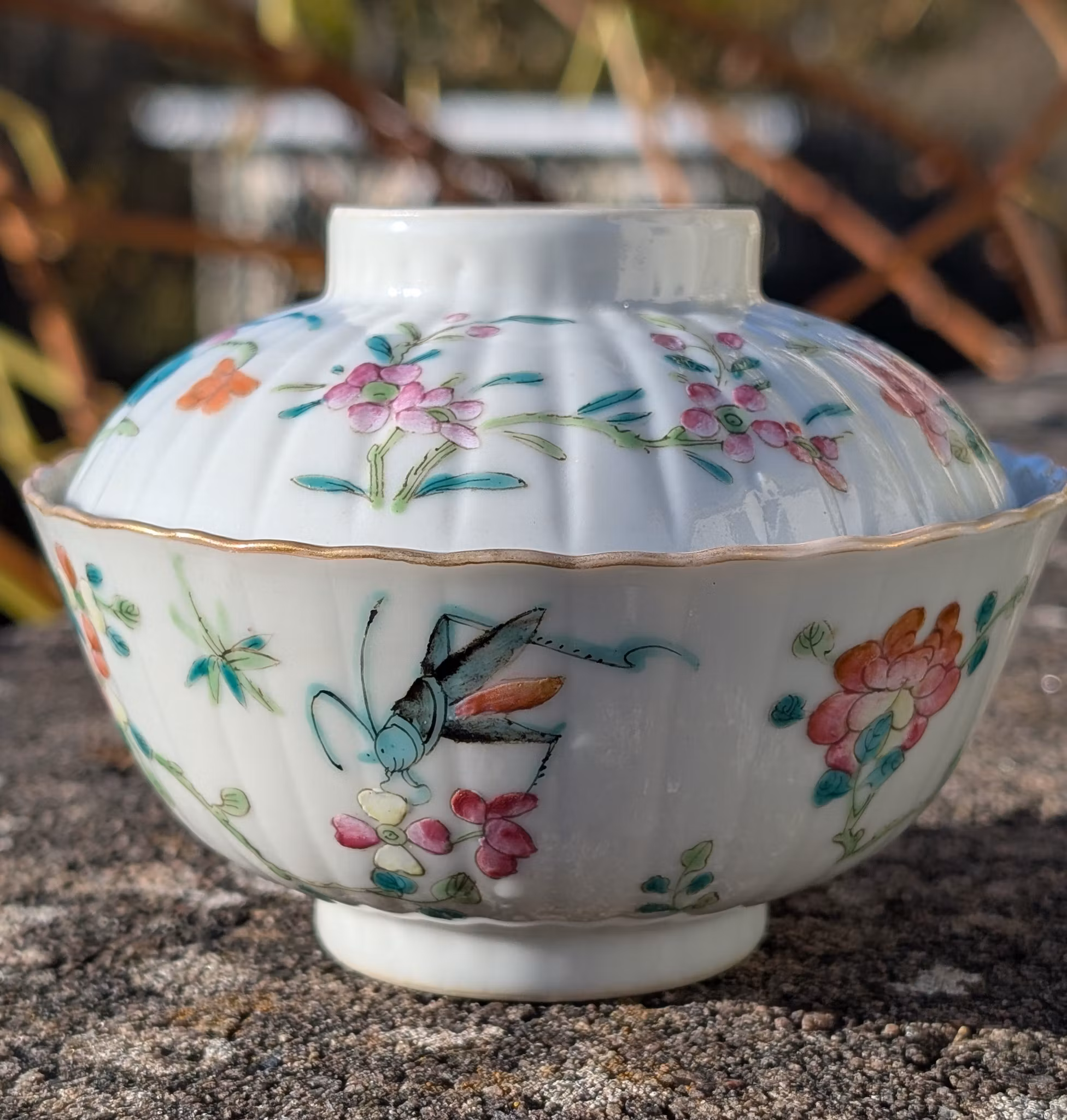 A nice Gaiwan with decoration of flowers and crickets. Stamped Tongzhi mark, but likely Guangxu period.