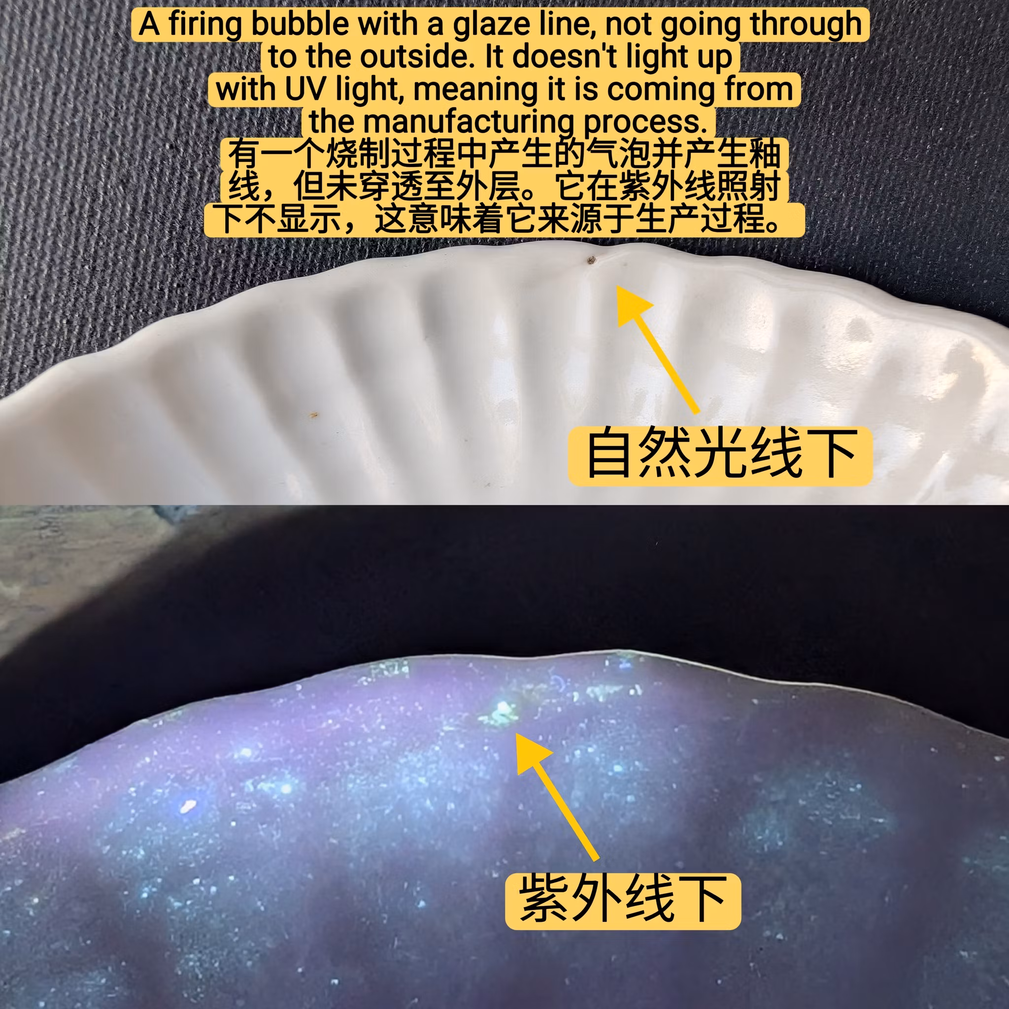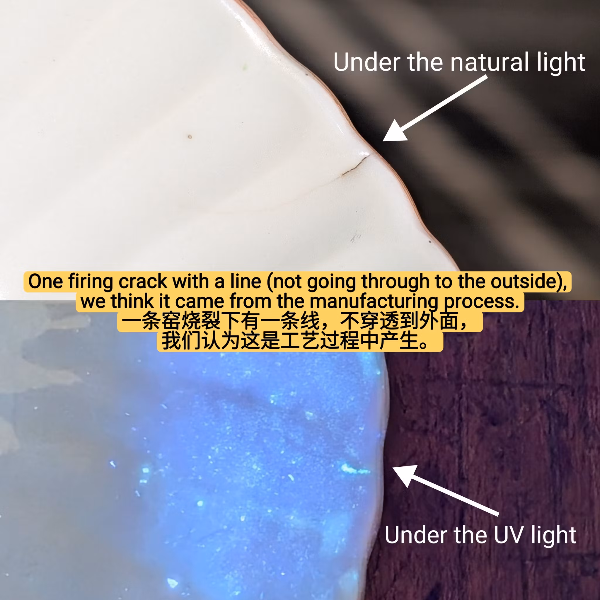 Checked with UV Lamp. One manufacturing/baking line to the cup's rim, from the firing crack, there is a glaze line(ca 1,5 cm) going down on the inside of the cup, it does not go through to the outside. The lid has a firing bubble with a glaze line, not going through to the outside. Neither of these lines lights up with UV light, meaning they came from the manufacturing process. See pictures! General wear.