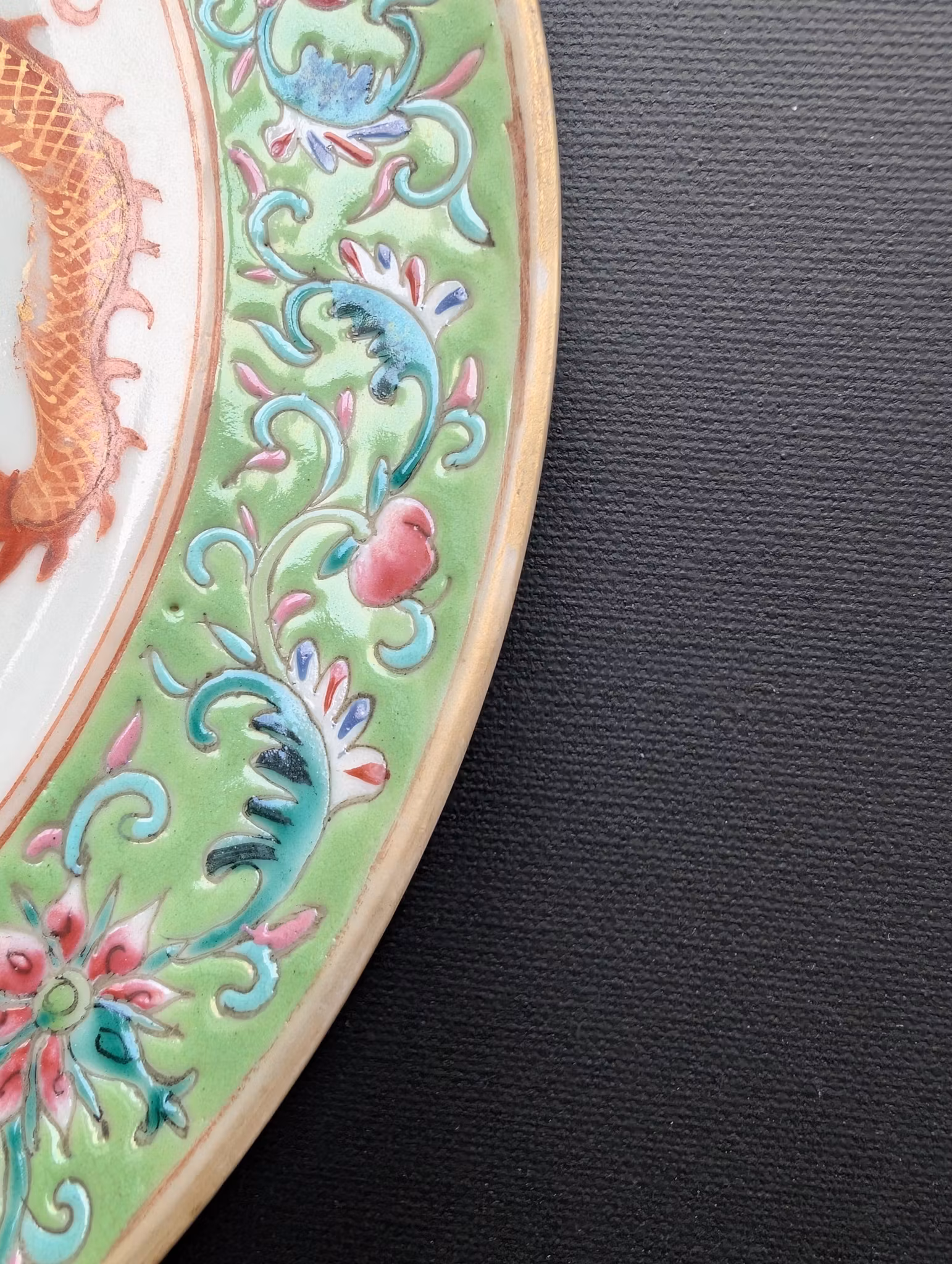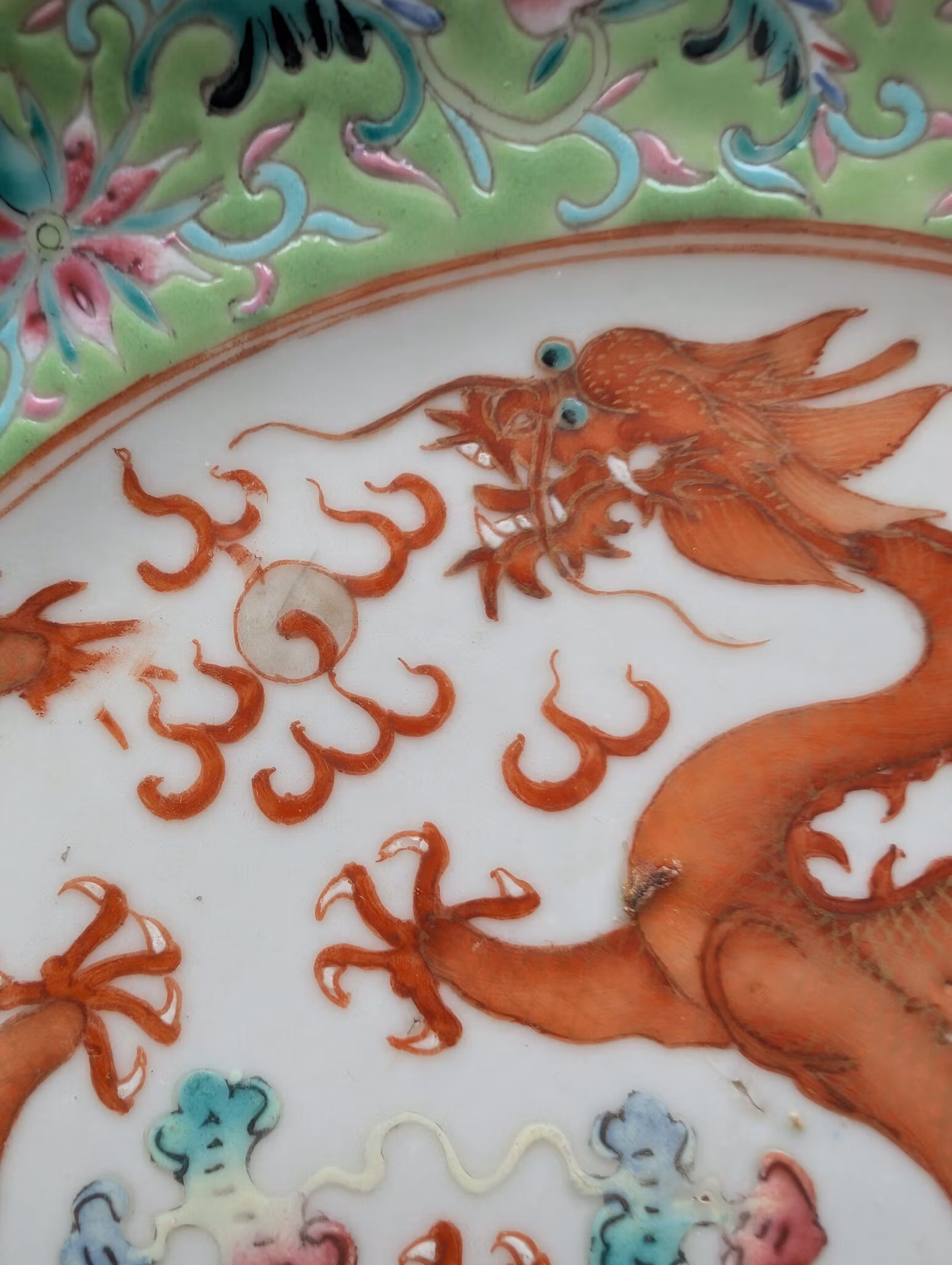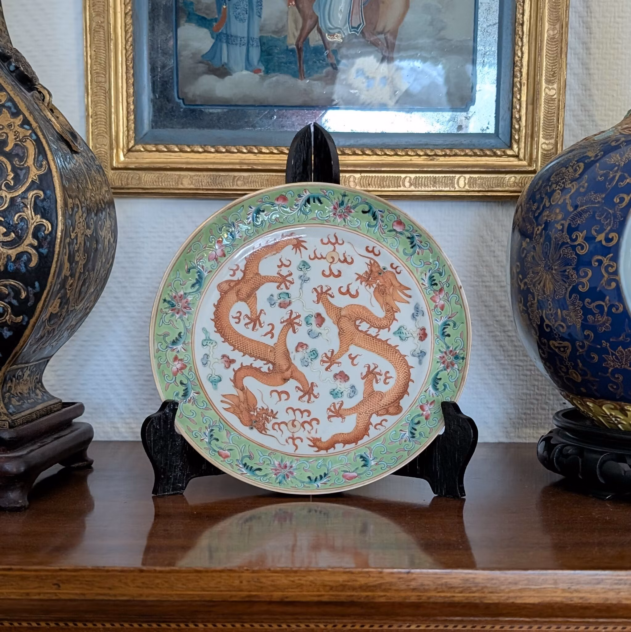 Beautiful plate decorated double dragons. Nice lime green brim decorated with flowers and peaches. Base with stamped Qianlong mark.