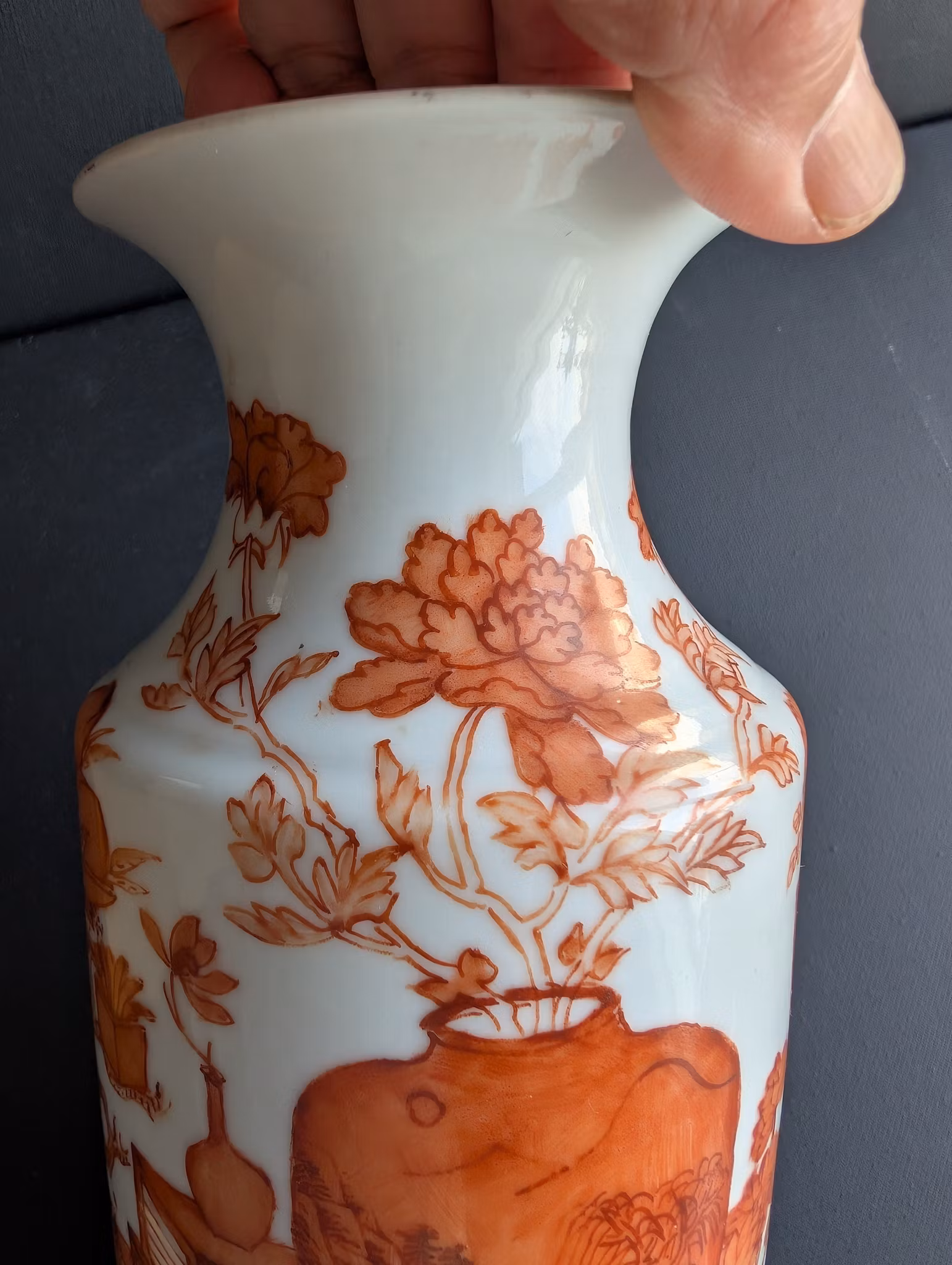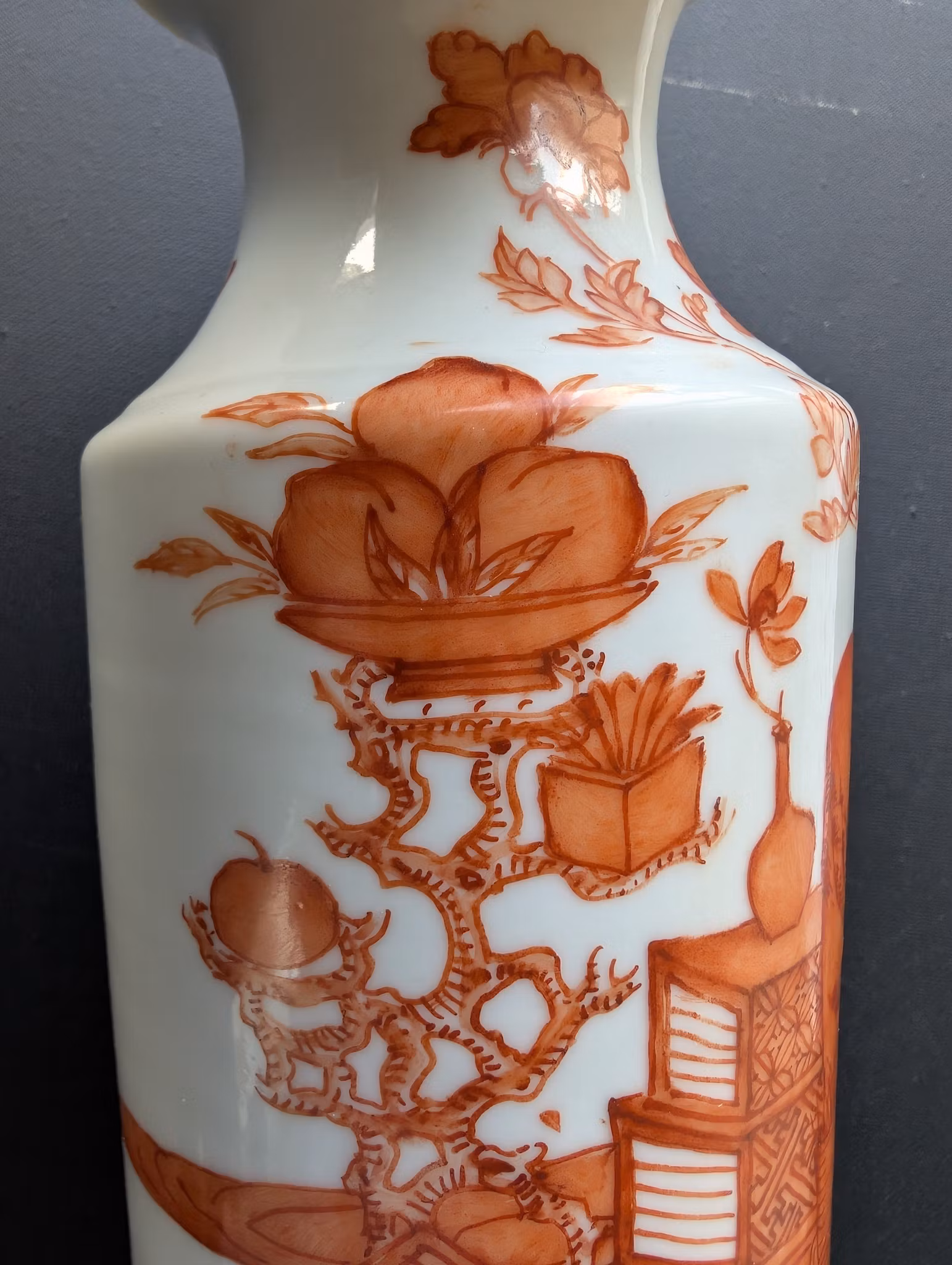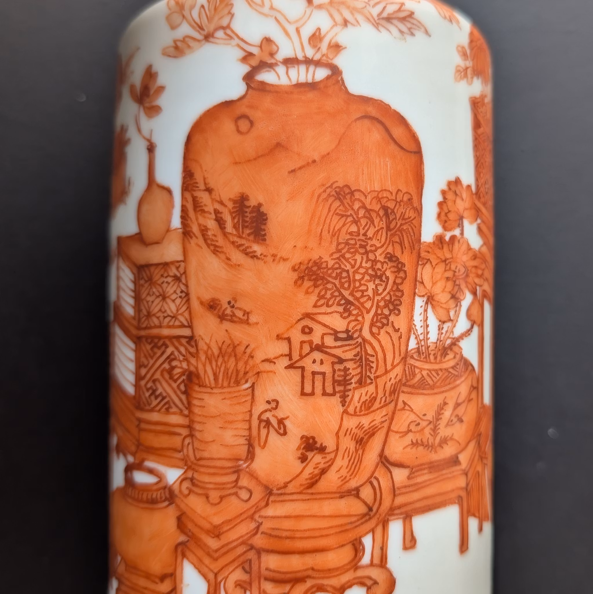 Beautiful porcelain vase decorated with hundreds of antiques 博古 in iron red. Base with stamped Tongzhi mark.