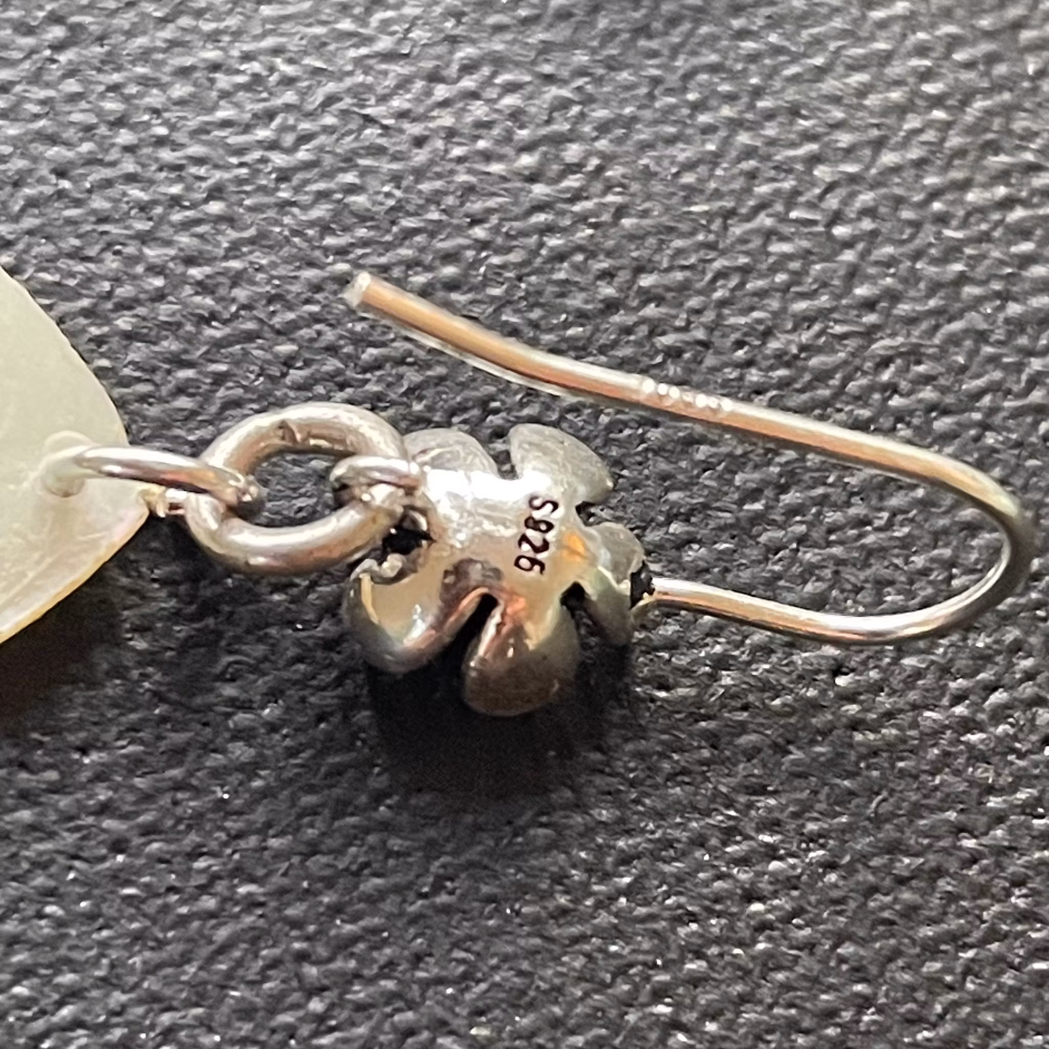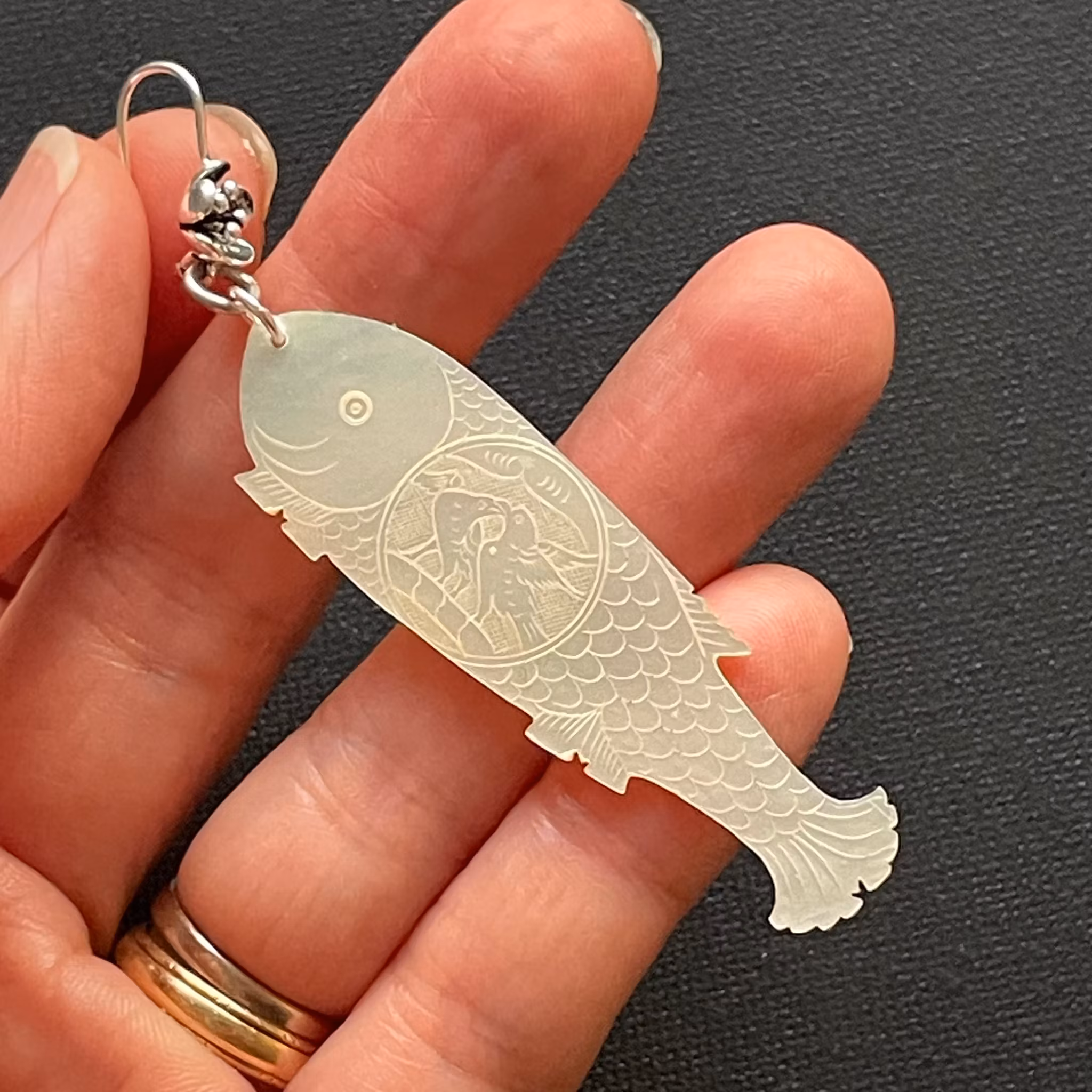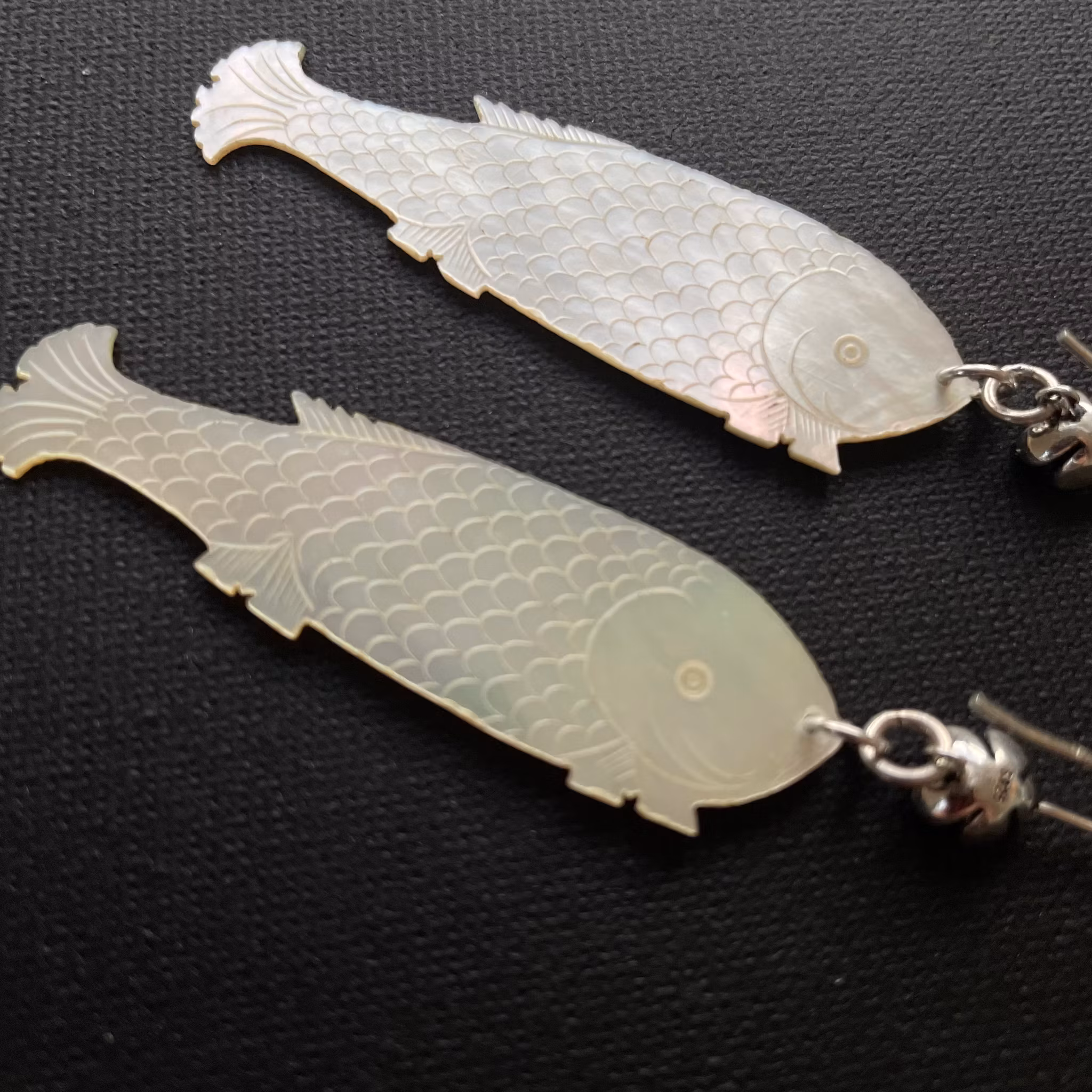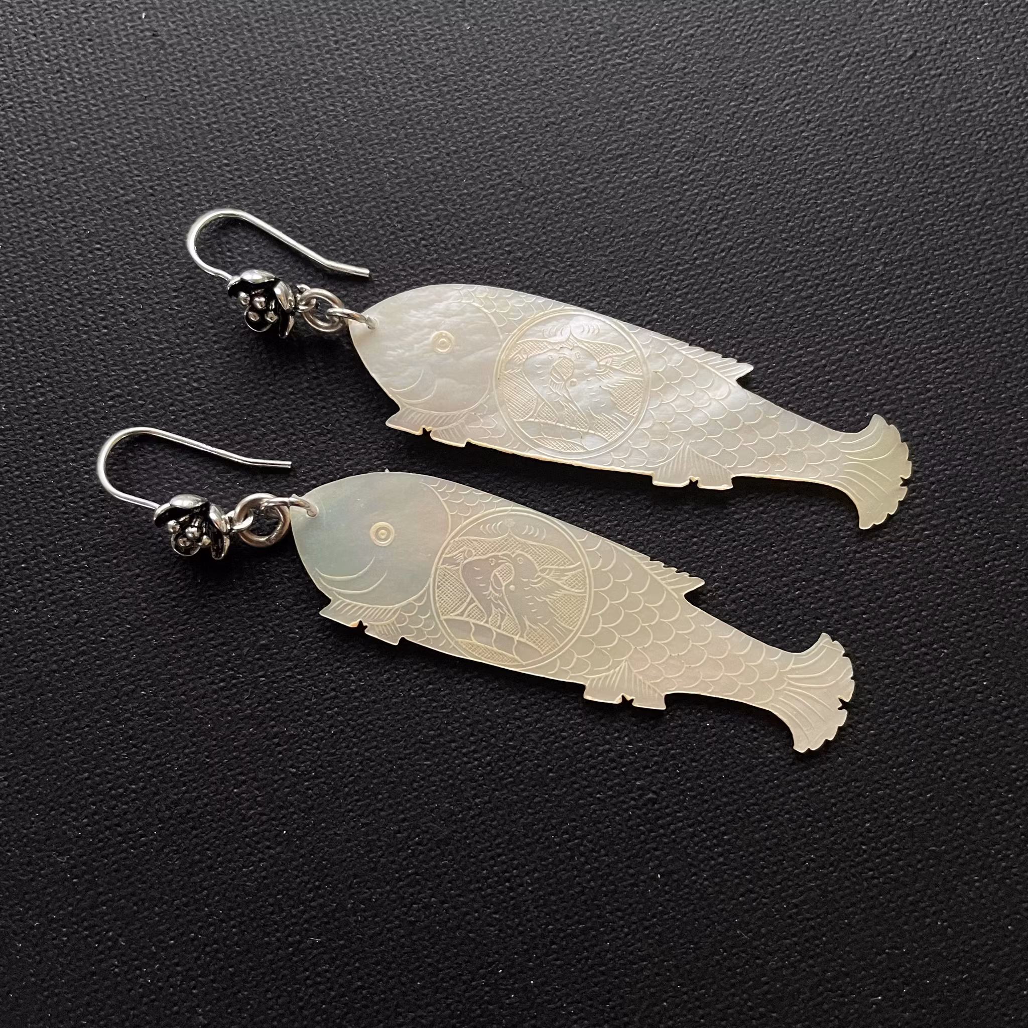 Handmade silver earrings with antique hand carved Chinese mother of pearl gaming counters chips tokens #1661