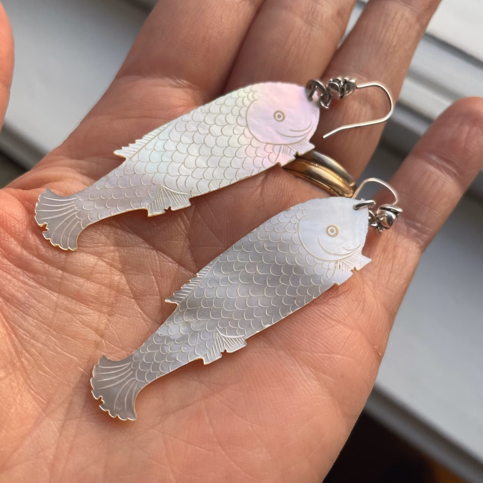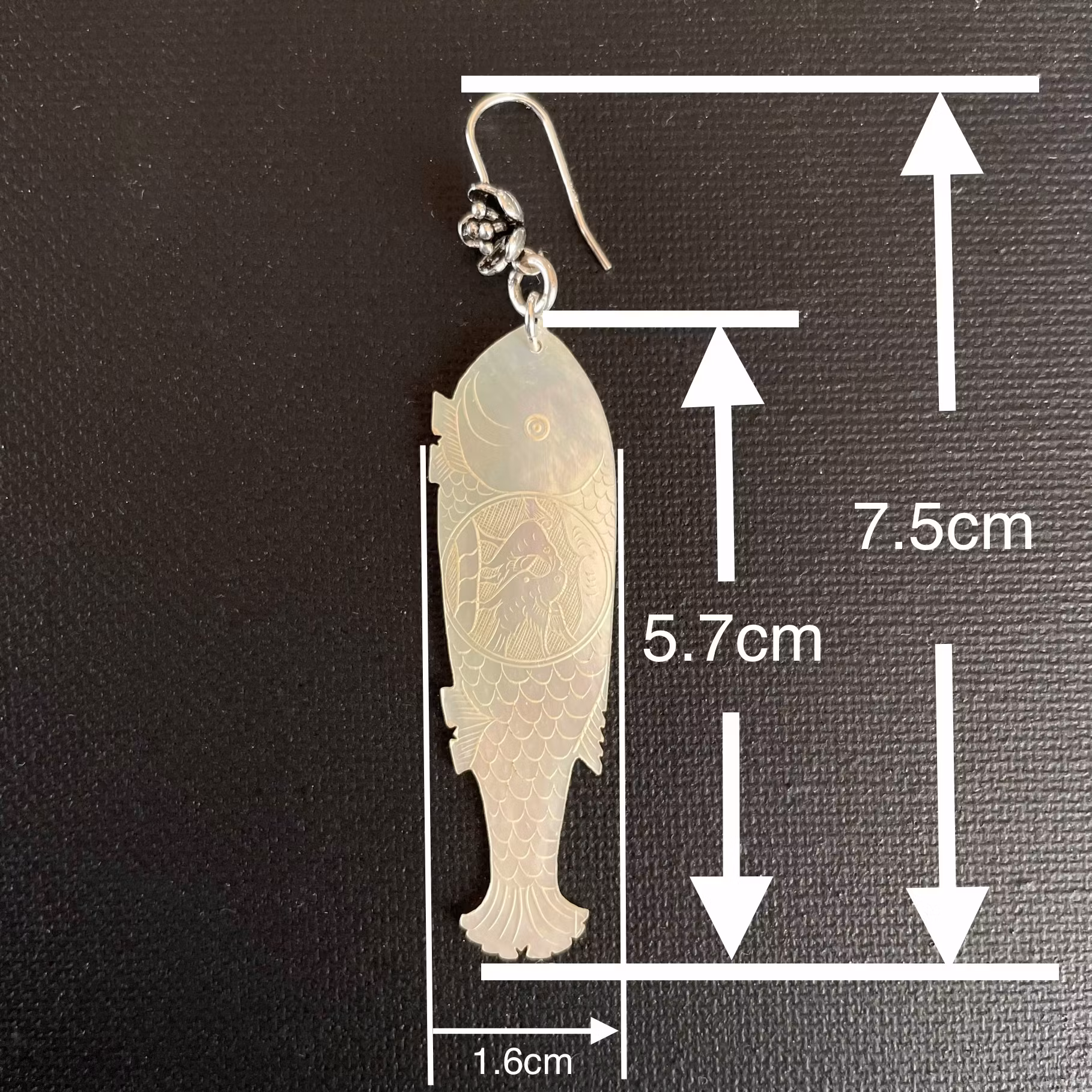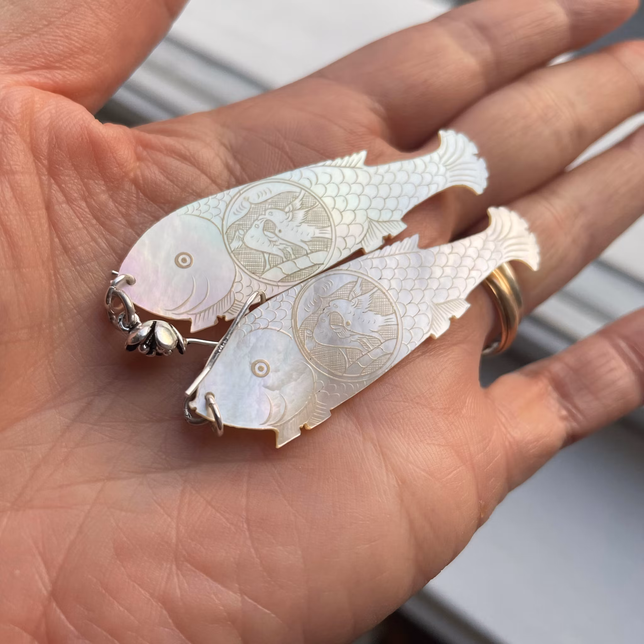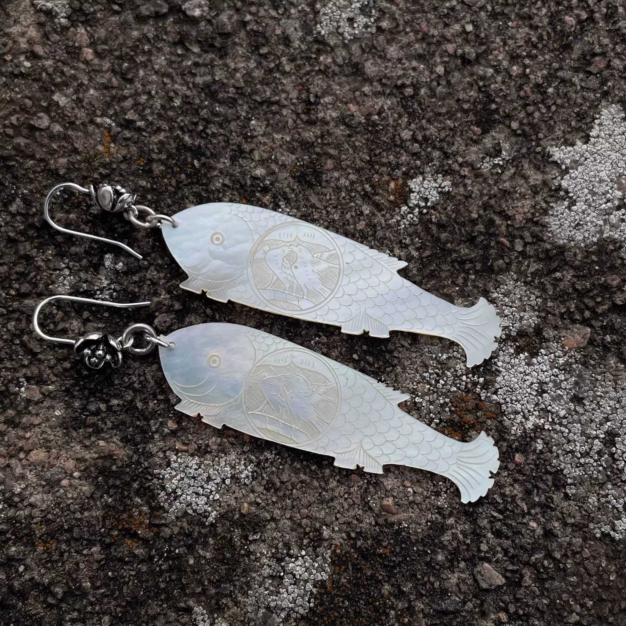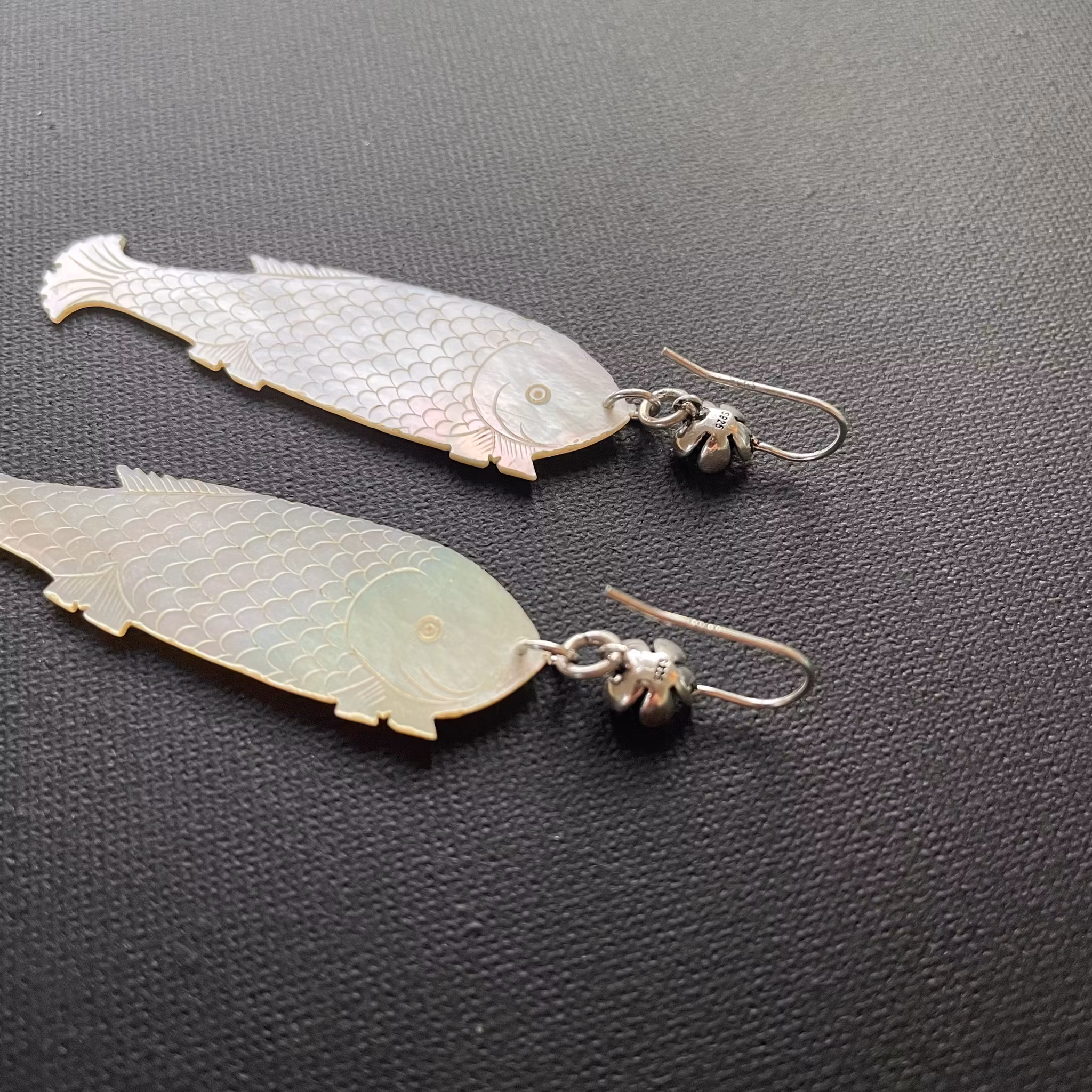 Handmade silver earrings with antique hand carved Chinese mother of pearl gaming counters chips tokens #1661